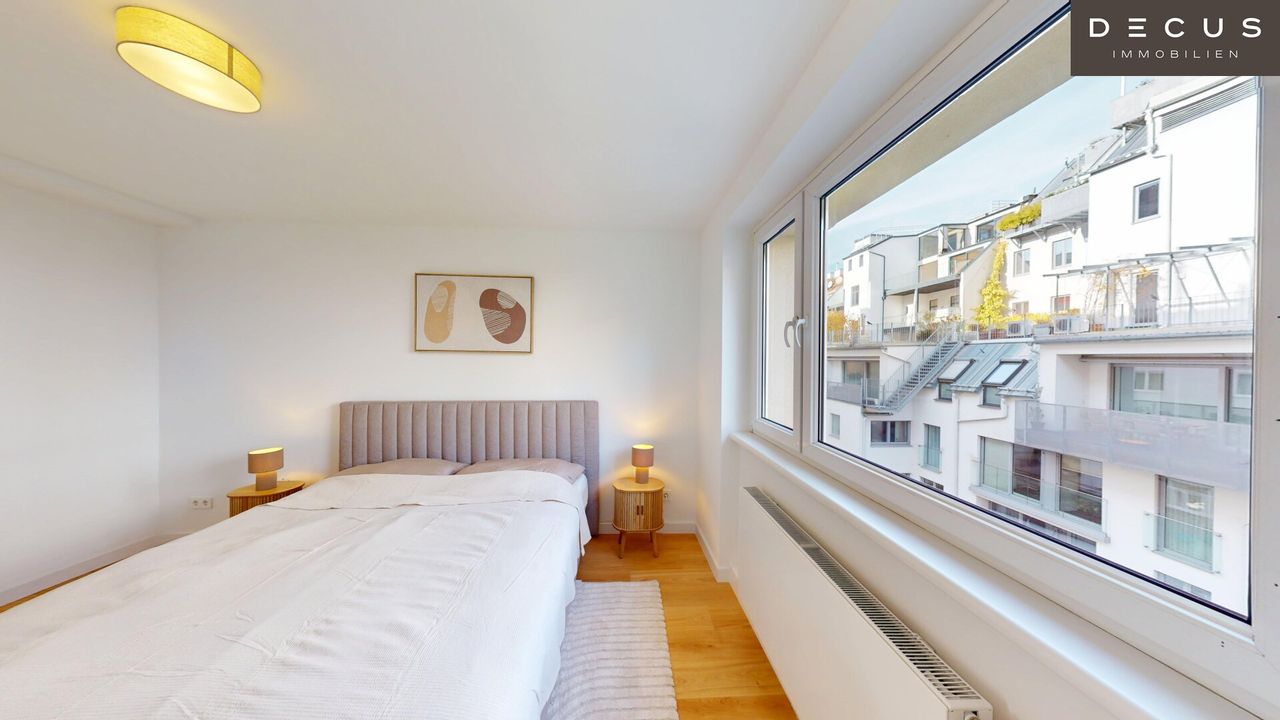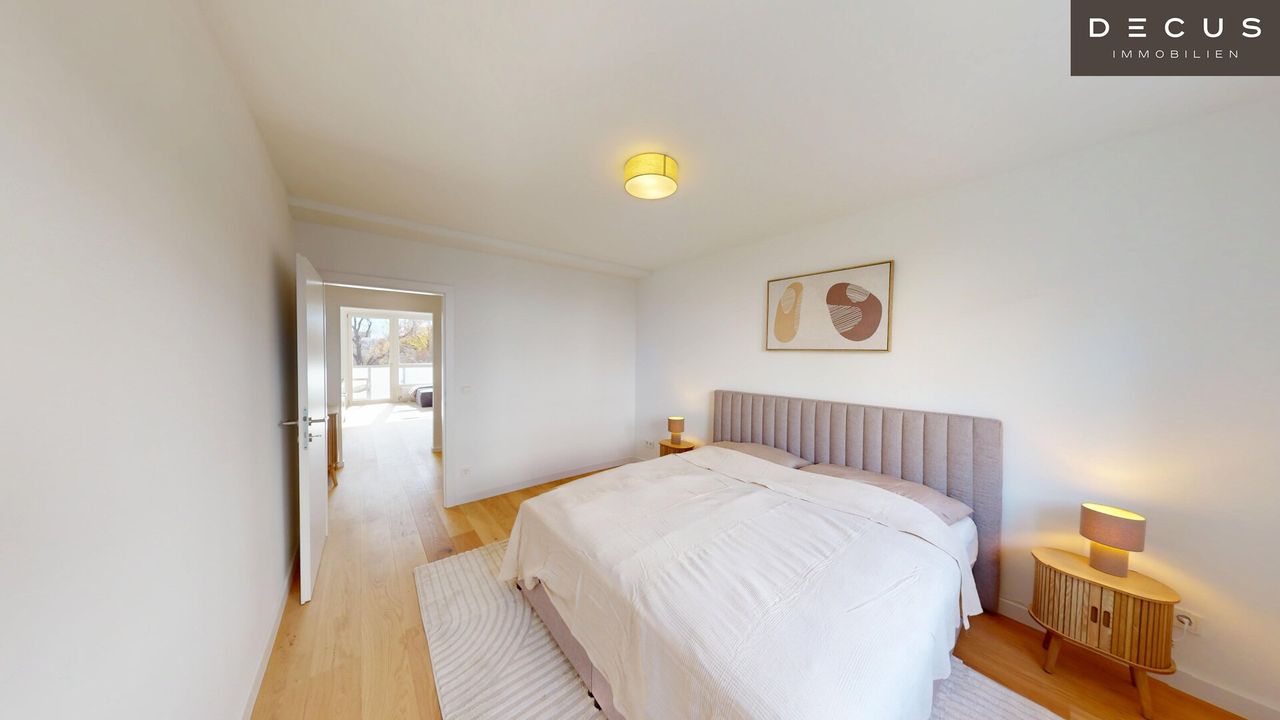 Die drei Schlafzimmer liegen ruhig zum Innenhof und bieten ein angenehmes Wohnklima – während das südseitige Wohnzimmer mit Loggia durch den herrlichen Grün- und Weitblick über den Schweizergarten bis hin zum Arsenal begeistert.