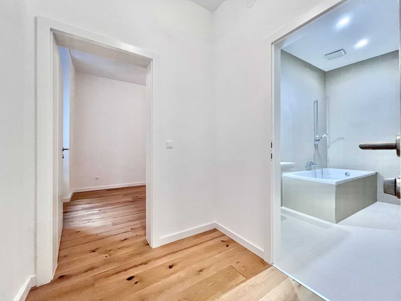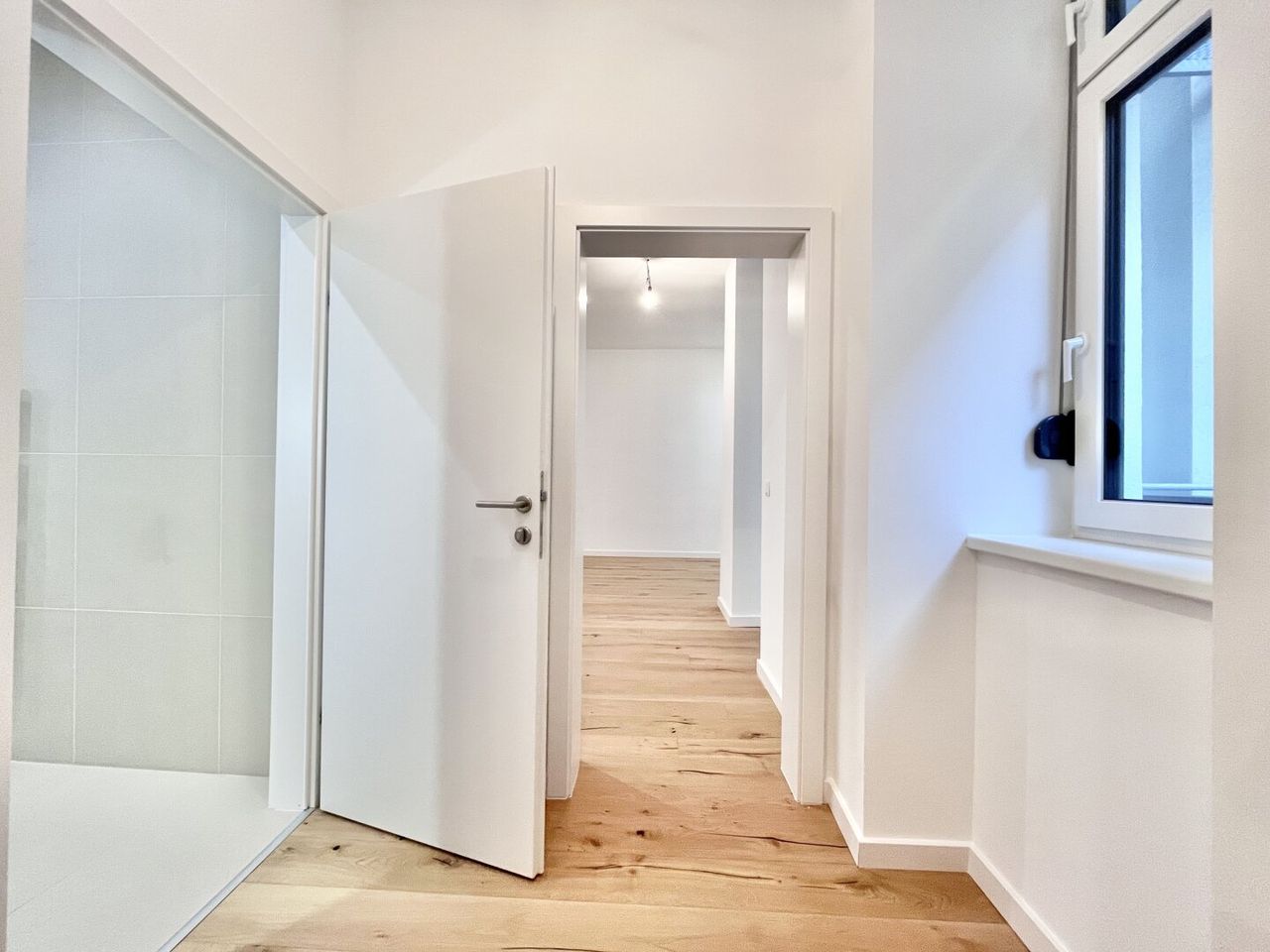1 separat begehbares Badezimmer inkl. Badewanne, Handwaschbecken und Waschmaschinenanschluss
