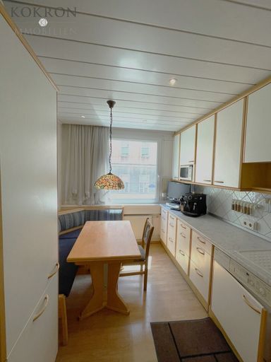 Vom Vorzimmer aus gelangen Sie in die voll ausgestattete Küche, wo die Waschmaschine integriert wurde, mit einer gemütlichen Sitzecke und einem Esstisch.
