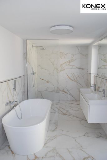 Modernes Badezimmer mit freistehender Badewanne, großem Duschbereich und Doppelwaschtisch