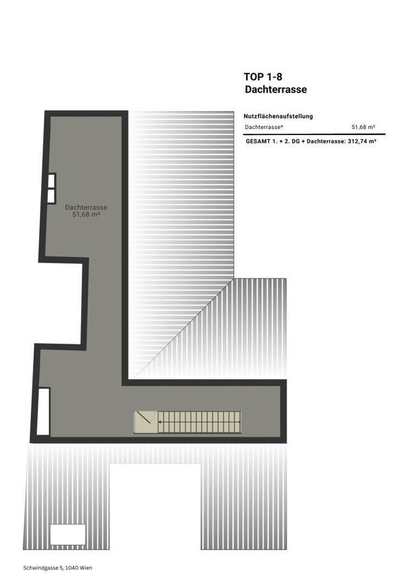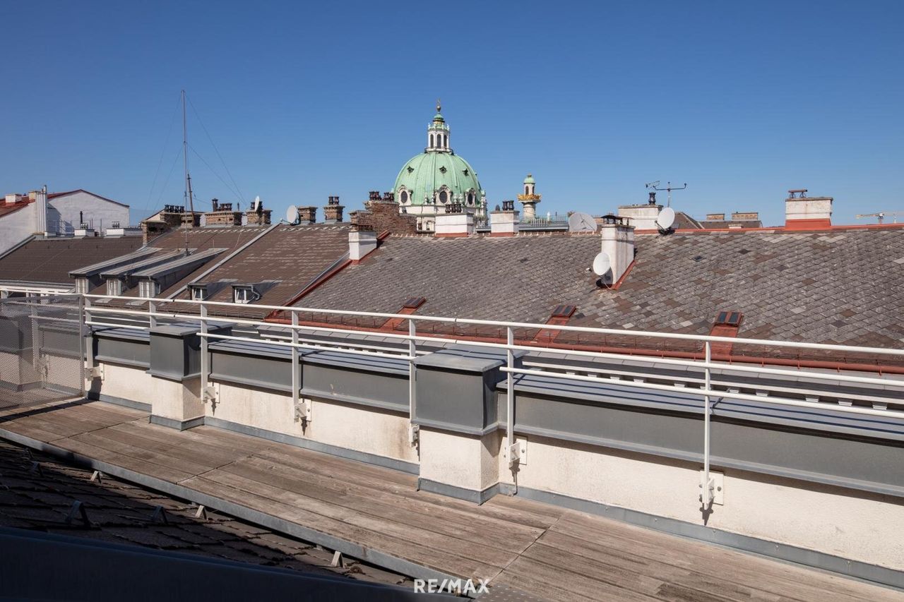 Zu den Highlights gehören die insgesamt knapp 100 m² Außenflächen. Zwei Terrassen auf Wohnebene sowie eine großzügige Dachterrasse bieten viel Platz für Freiraum und eröffnen einen eindrucksvollen Blick über die Dächer Wiens – mit Sicht auf die Karlskirche, den Stephansdom und das umliegende Palaisviertel.