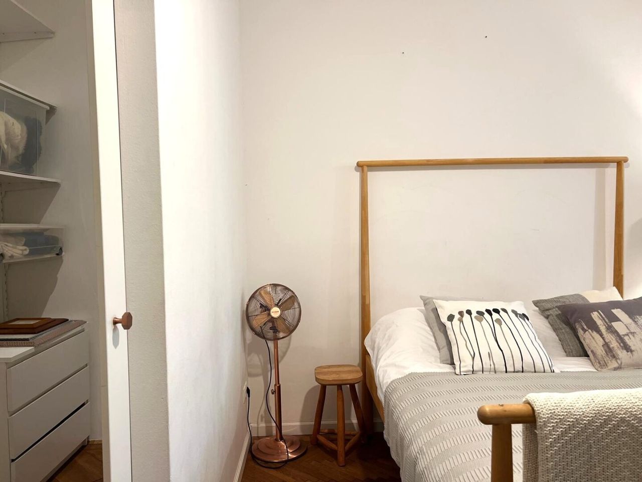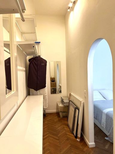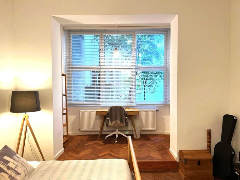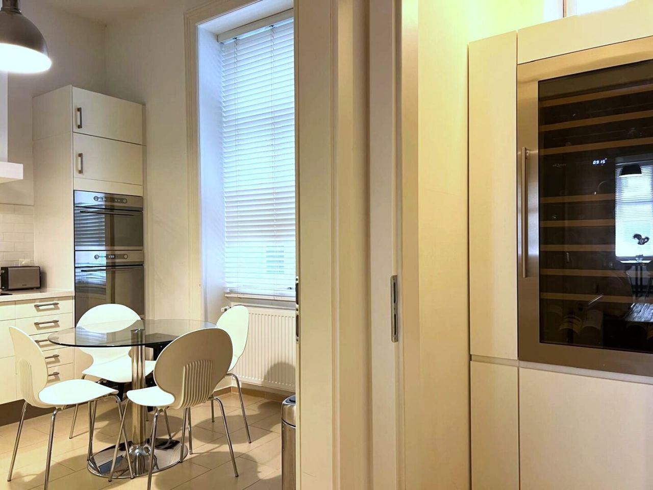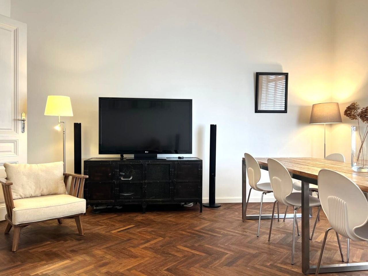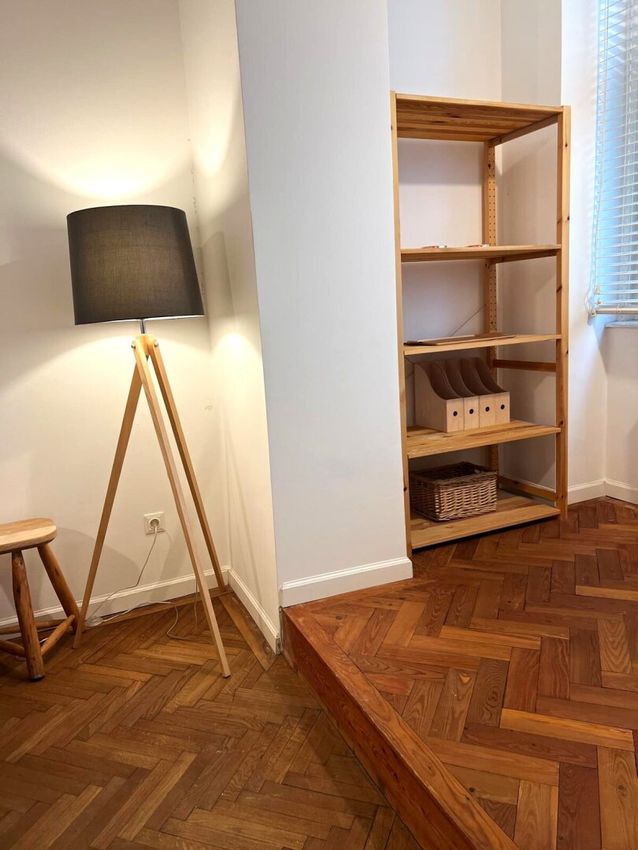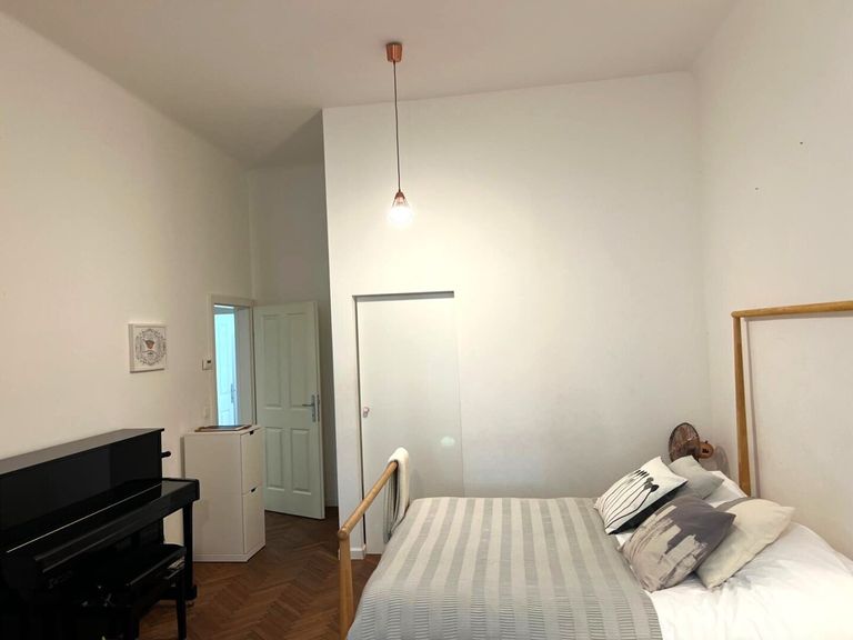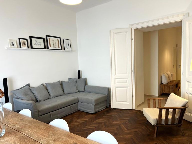 Bei der Renovierung dieser gut-geschnittenen Wohnung wurde bei der Auswahl der verwendeten Materialen große Sorgfalt angewandt. Die hervorragend erhaltenen Original-Fischgrät-Parketten wurden wunderschön aufbereitet und geölt. Die Wohnung ist mit Bedacht gewählten Möbelstücken sowie Leuchten und Lampen bestückt. Sie geben der Wohnung ihren attraktiven "Spirit" und Charakter. Einbauten wie z.B. begehbare Schränke in den Schlafzimmern, erweisen sich als besonders praktisch. Äußerst charmant wirkt die Podest-artige Anhebung des Bodens beim Fensterbereich im hofseitigen Schlafzimmer. Große Fensterflächen sorgen für gute Ausleuchtung mit Tageslicht. Das Kabinett verfüg lediglich über ein schmales Fenster zum Vorraum, was aber besonders ansprechend wirkt.