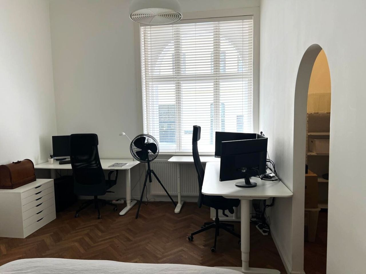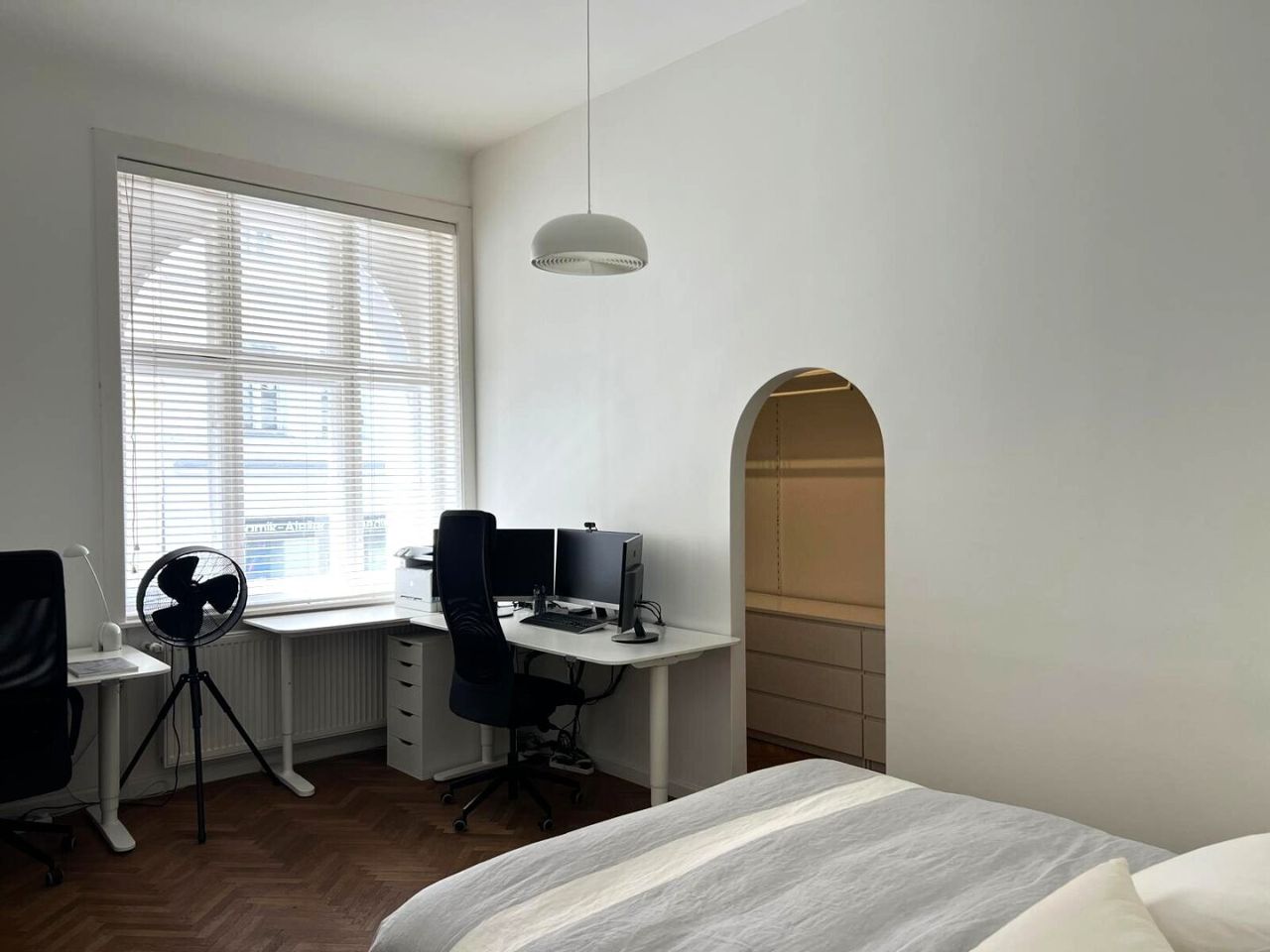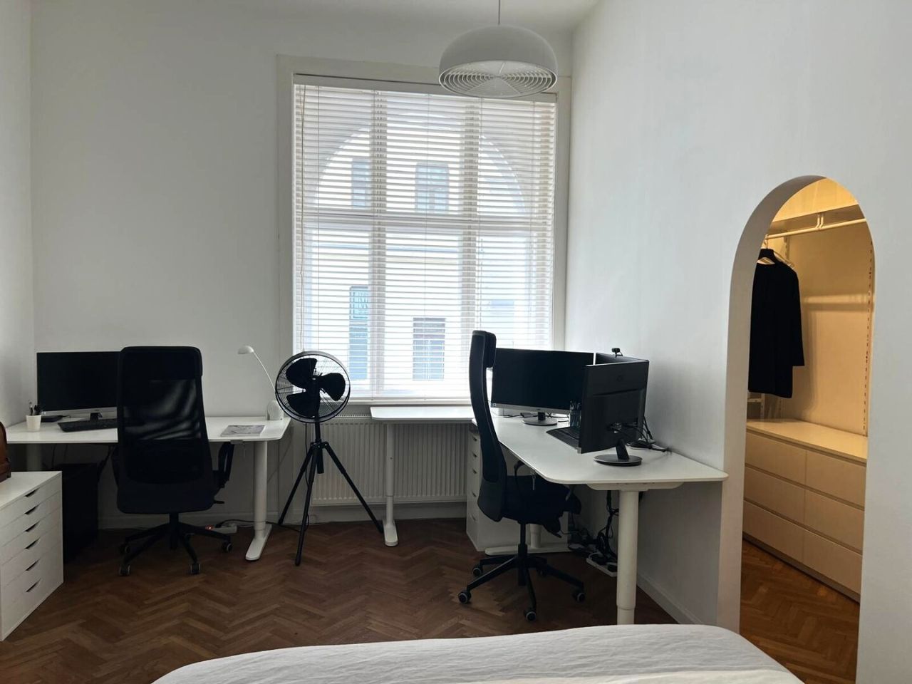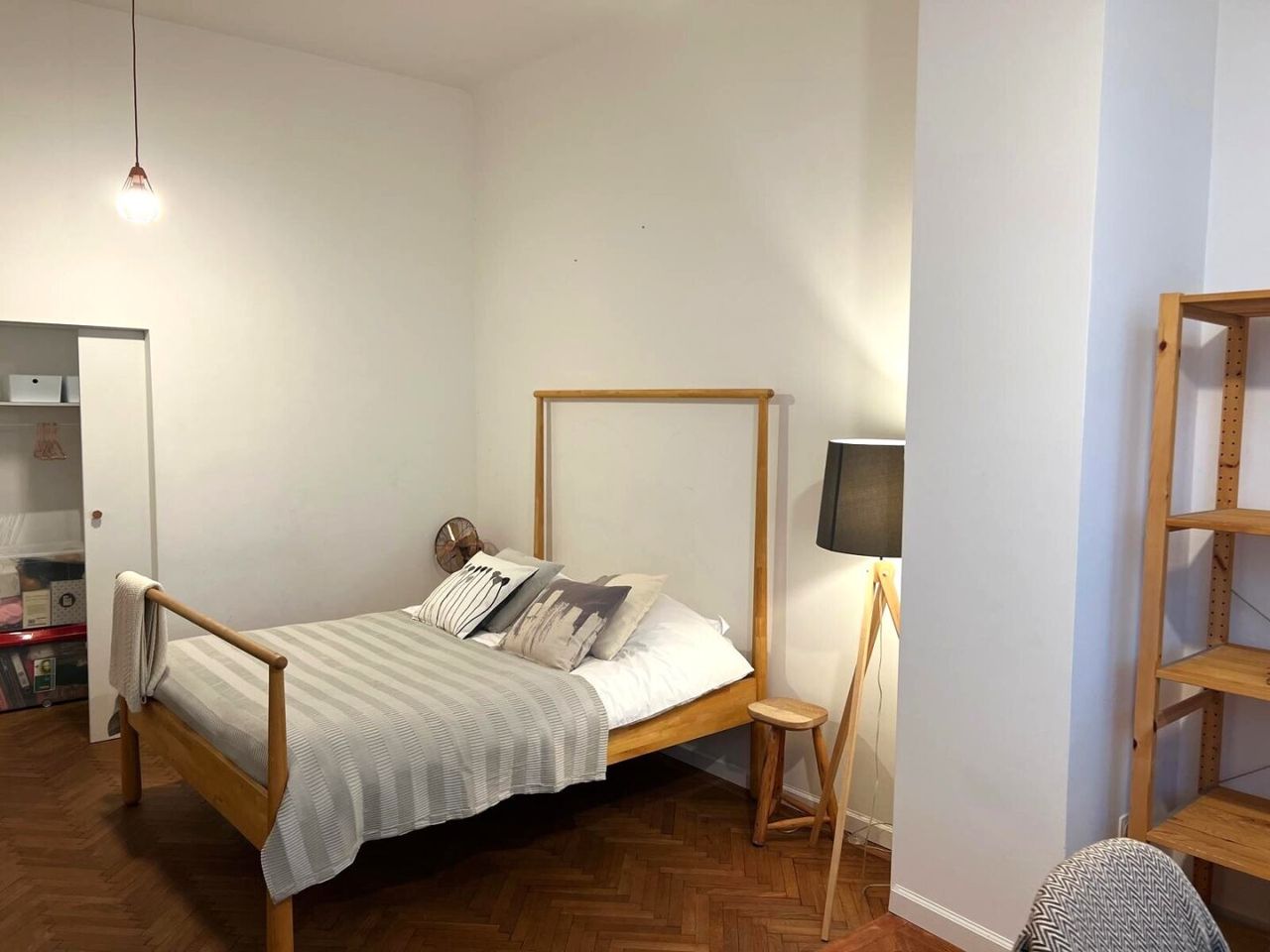 Bei der Renovierung dieser gut-geschnittenen Wohnung wurde bei der Auswahl der verwendeten Materialen große Sorgfalt angewandt. Die hervorragend erhaltenen Original-Fischgrät-Parketten wurden wunderschön aufbereitet und geölt. Die Wohnung ist mit Bedacht gewählten Möbelstücken sowie Leuchten und Lampen bestückt. Sie geben der Wohnung ihren attraktiven "Spirit" und Charakter. Einbauten wie z.B. begehbare Schränke in den Schlafzimmern, erweisen sich als besonders praktisch. Äußerst charmant wirkt die Podest-artige Anhebung des Bodens beim Fensterbereich im hofseitigen Schlafzimmer. Große Fensterflächen sorgen für gute Ausleuchtung mit Tageslicht. Das Kabinett verfüg lediglich über ein schmales Fenster zum Vorraum, was aber besonders ansprechend wirkt.