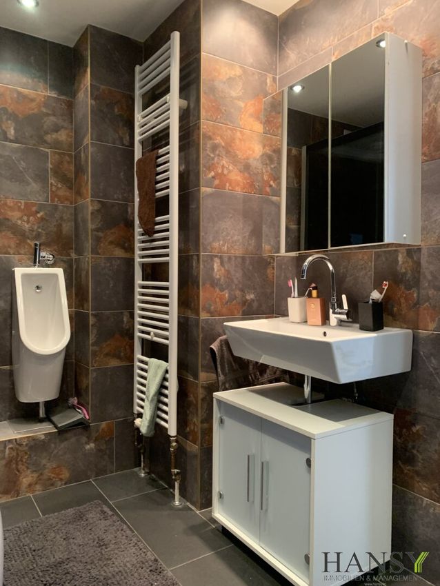 - Waschbecken, Pissoir, WC sowie Waschmaschinenanschluss inklusive Waschmaschine im Badezimmer