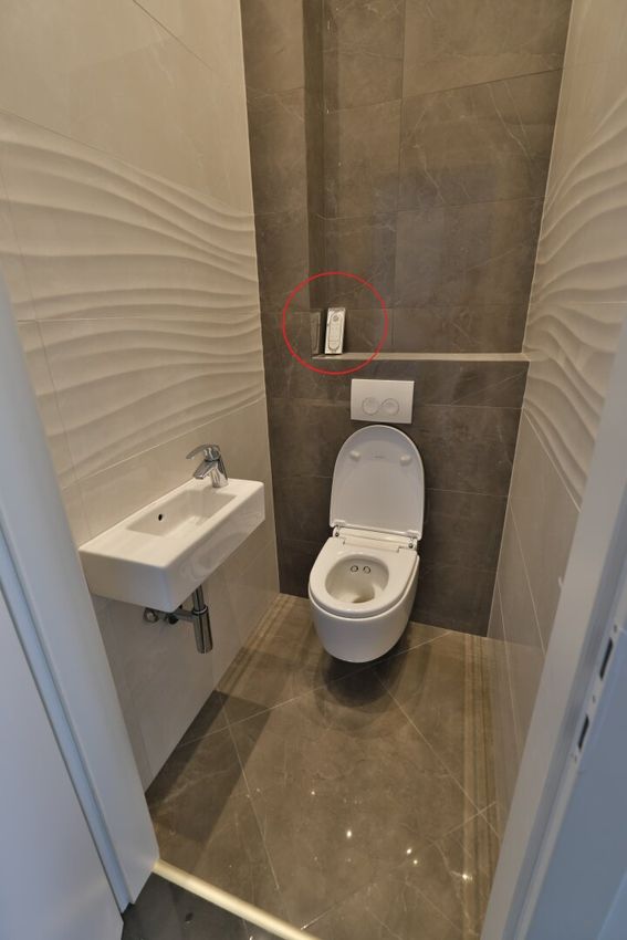 - Toilette mit Handwaschbecken. WC-Schale mit Waschprogrammen samt Fernsteuerung: Kalt, Warm, Hochdruck, Lüften und Trocknen (Marke Geberit)