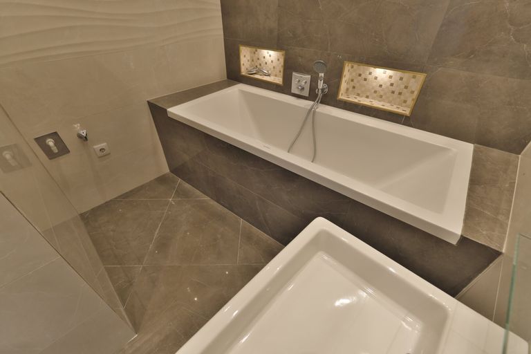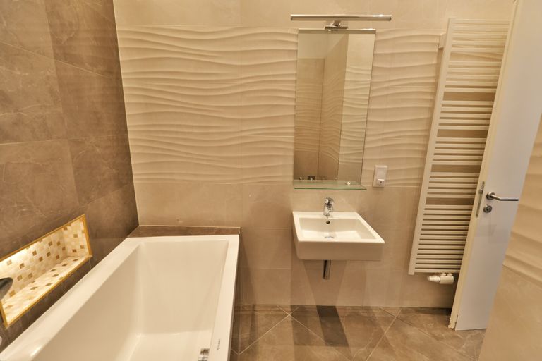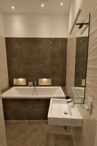 - sehr hochwertig verfließtes Badezimmer mit Marken-Badewanne, Waschbecken, Waschmaschinenanschluss