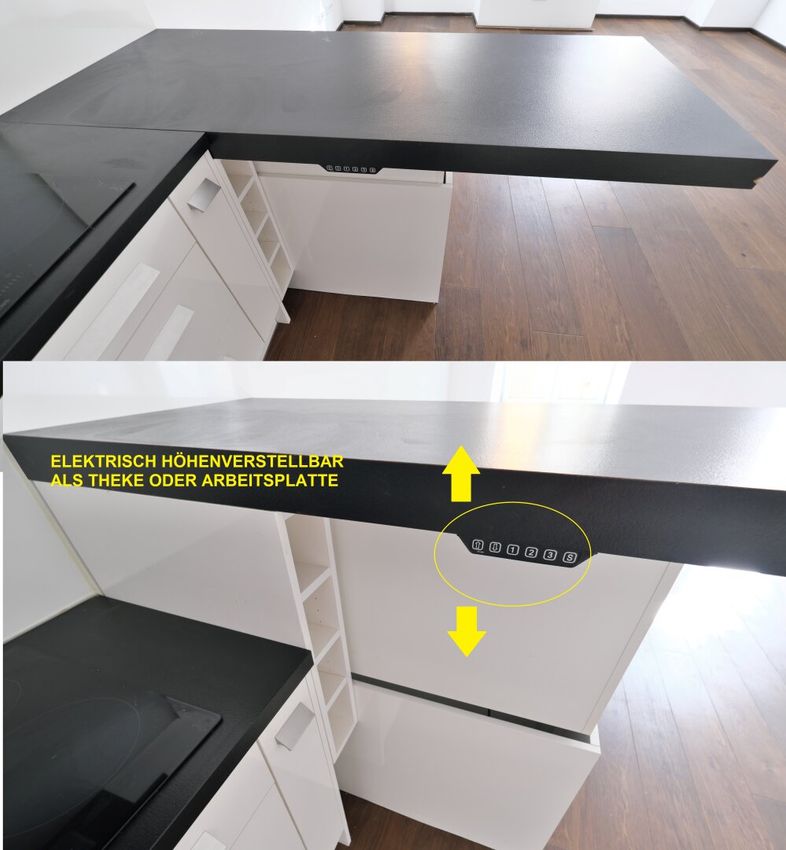 Die Kochinsel ist höhenverstellbar sodaß man sie wahlweise als Theke zum Frühstücken oder als Arbeitsplatte verwenden kann. (Im Inserat in unserer Homepage kann man sich ein Video davon ansehen)