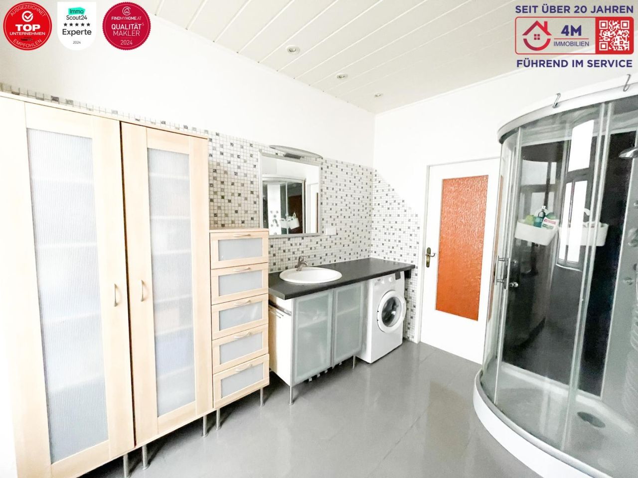 Badezimmer: Großzügig gestaltet mit Dusche und Fenster für optimale Belüftung.