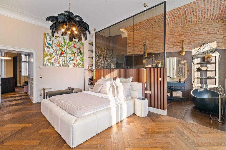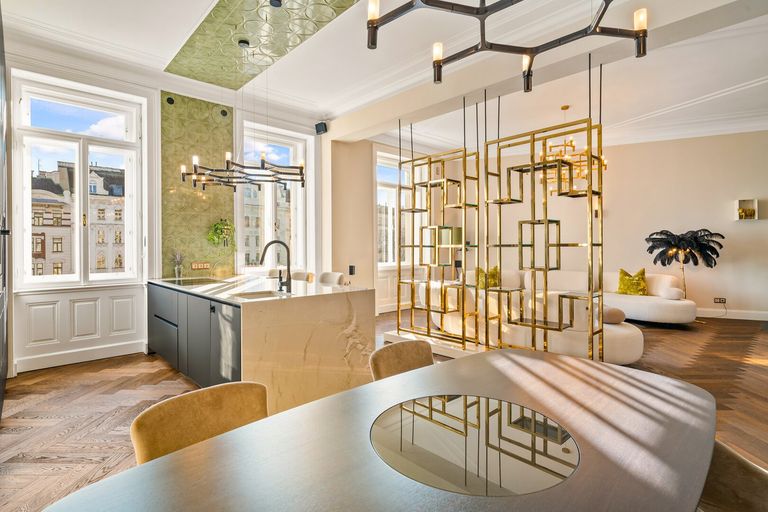 Der repräsentative Wohn- und Essbereich ist klar zoniert und lebt von großen Fensterflächen, hochwertigen Oberflächen und einem Kamin als ruhigem Mittelpunkt. Der Ausblick öffnet sich in das Naschmarkt-Umfeld mit direktem Bezug zur neu gestalteten Parkzone – eine Lage, die urbanes Leben, Kultur und Kulinarik auf besonders angenehme Weise vereint.