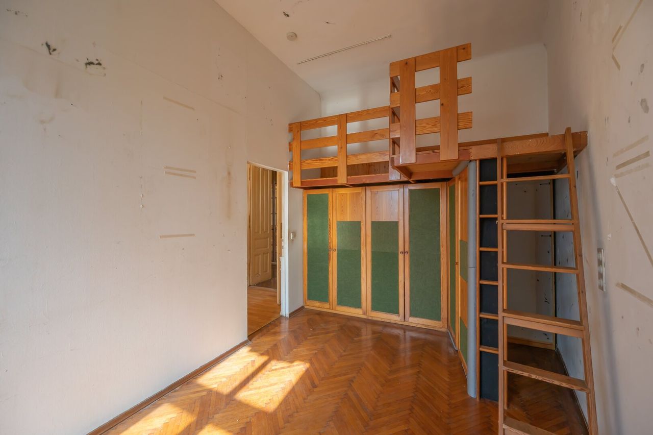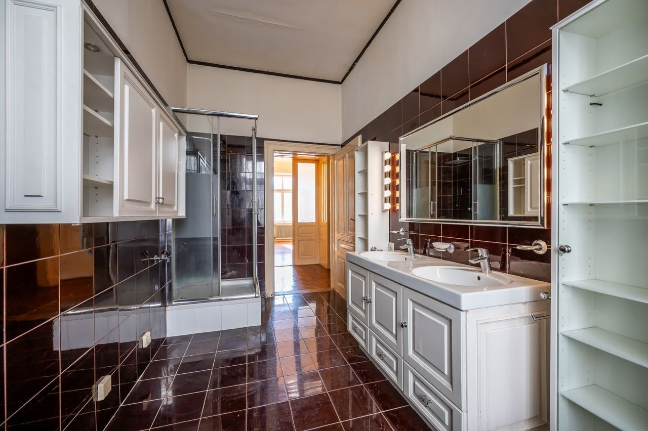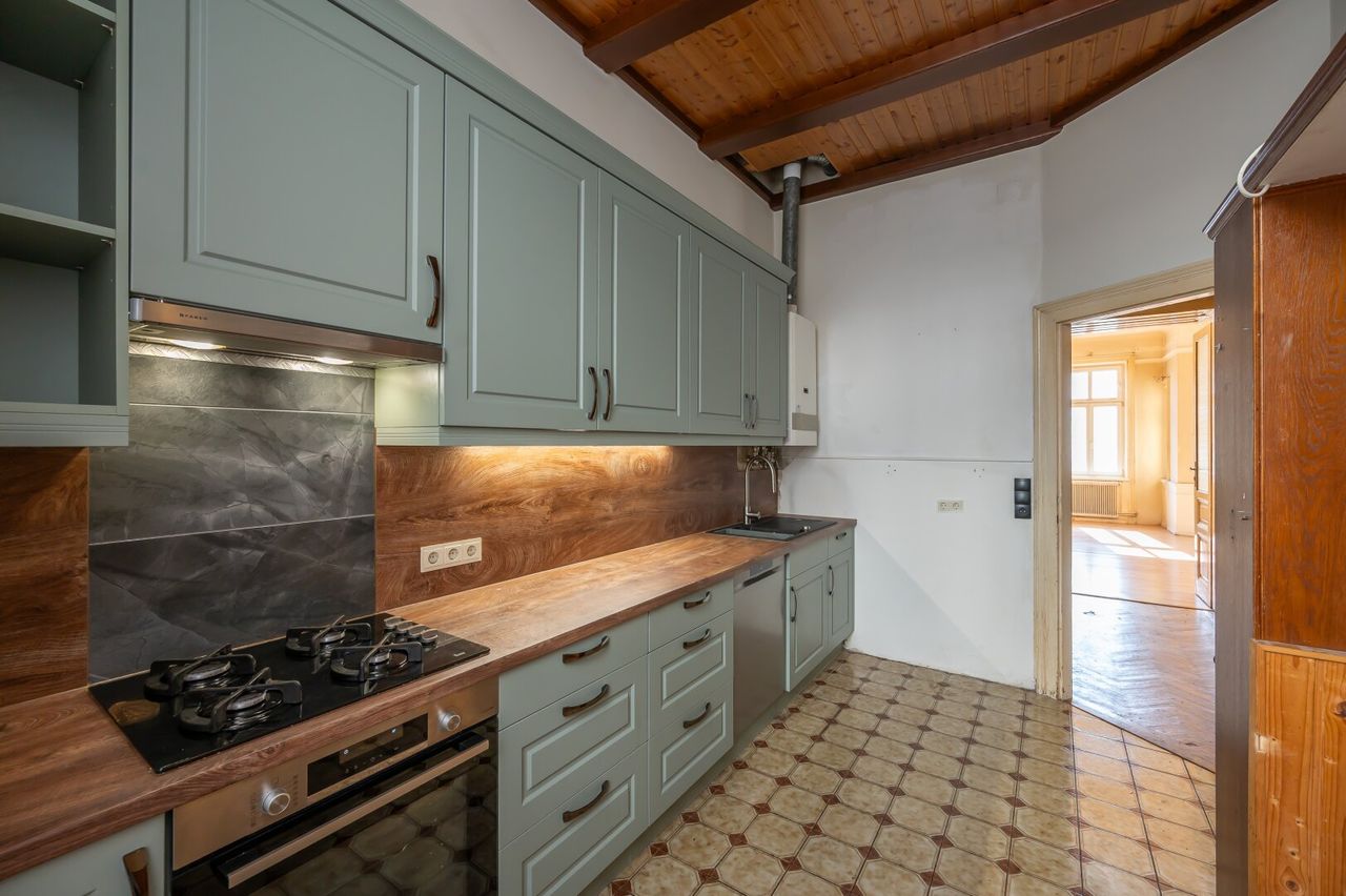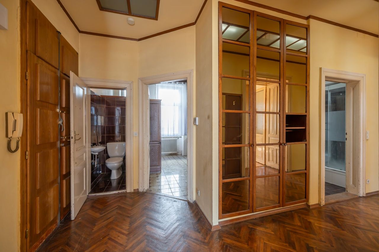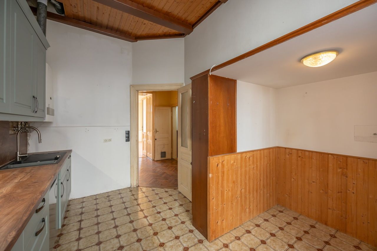 Die Wohnung befindet sich im 2. Stock (ohne Lift) und in einem sanierungsbedürftigen Zustand. Sie bietet sehr viele Elemente eines Stilaltbaus: