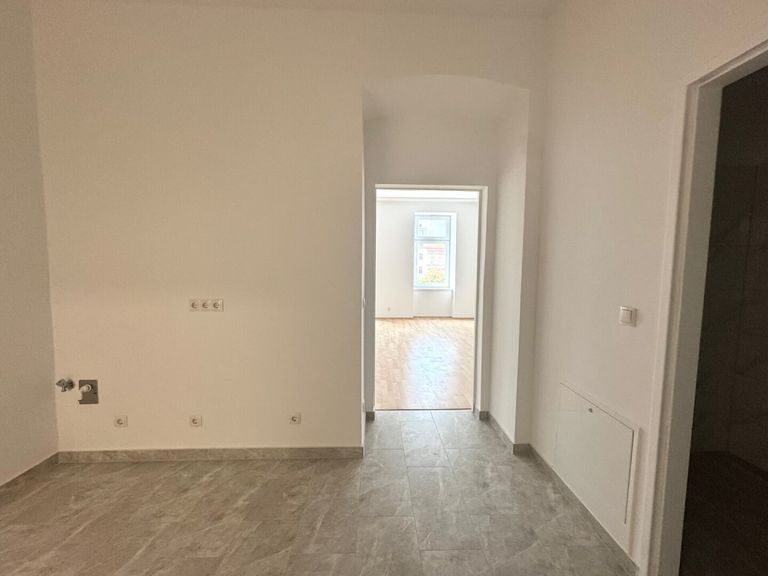 Bereits beim Betreten empfängt Sie ein großzügiger Vorraum mit eleganter Küchenzeile, der den praktischen Mittelpunkt der Wohnung bildet. Von hier aus gelangen Sie in das lichtdurchflutete Wohnzimmer, das durch die beeindruckende Altbau-Raumhöhe besonders offen und einladend wirkt. Das gemütliche Schlafzimmer sorgt für erholsame Nächte, während das moderne Badezimmer mit hochwertigen Sanitäranlagen keine Wünsche offenlässt.
