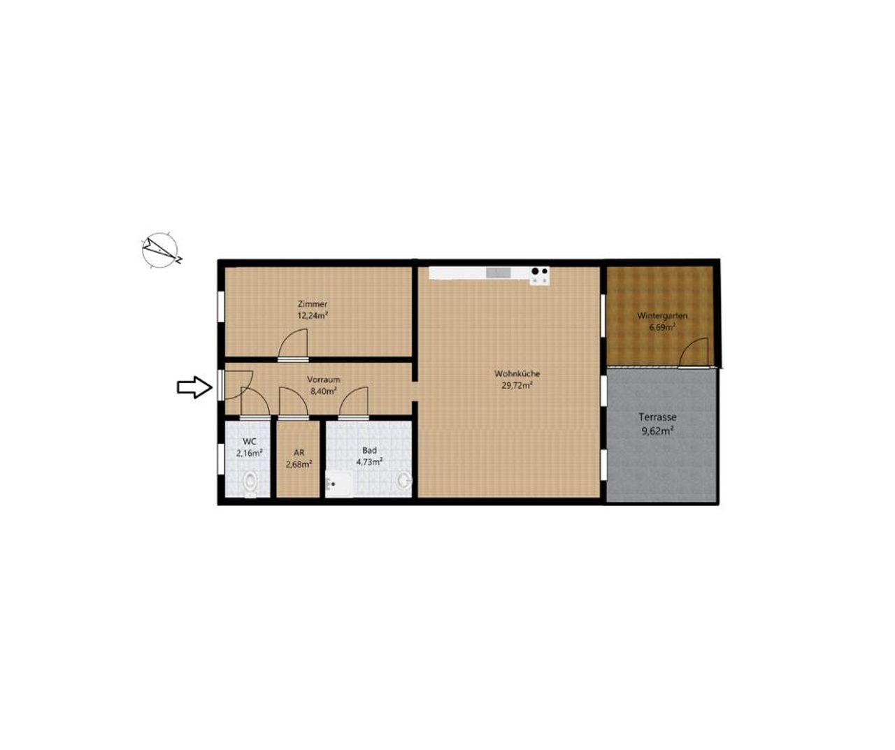Angrenzend daran befindet sich der Wintergarten, der den Wohnraum harmonisch erweitert und zu jeder Jahreszeit ein besonderes Wohngefühl vermittelt. Von hier gelangen Sie direkt in Ihren eigenen Freihof – ein geschützter Außenbereich, der zum Durchatmen einlädt und genügend Platz bietet, um Ihre persönliche grüne Oase zu gestalten.