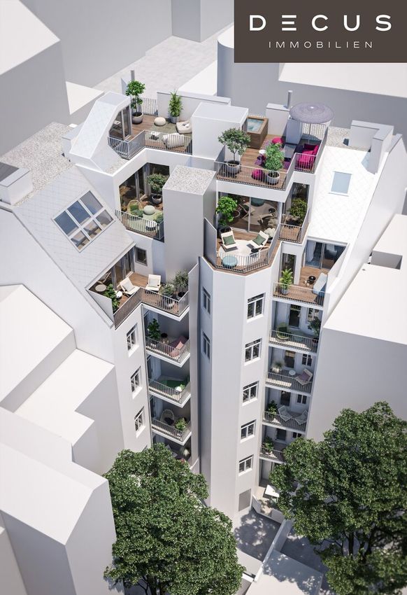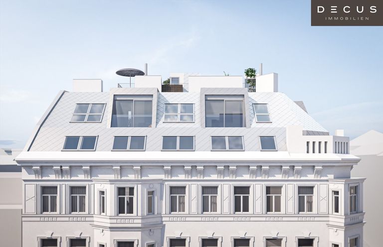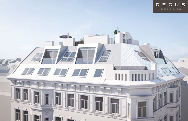 Gemäß der uns vorliegenden bereits bewilligten Planung sollen 4 hochwertige Dachgeschosswohnungen mit einer Wohnnutzfläche (inkl. 1 Loggia) von ca. 452 m² sowie großzügige Freiflächen in Form von Terrassen im Ausmaß von ca. 110 m² auf drei Ebenen (1.DG sowie 2.DG und einer Dachterrasse) entstehen.