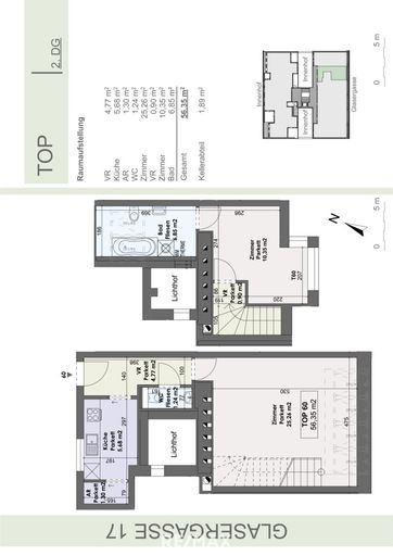 Die hier angebotene DG-Maisonette Wohnung hat 2 Zimmer. Die Hauptebene umfasst Küche, ein WC, Abstellraum und Wohnbereich. Alles separat begehbar. Im oberen Teil ist das Schlafzimmer, Badezimmer mit Wanne, ein weiteres WC und einen Waschmaschinenanschluß.