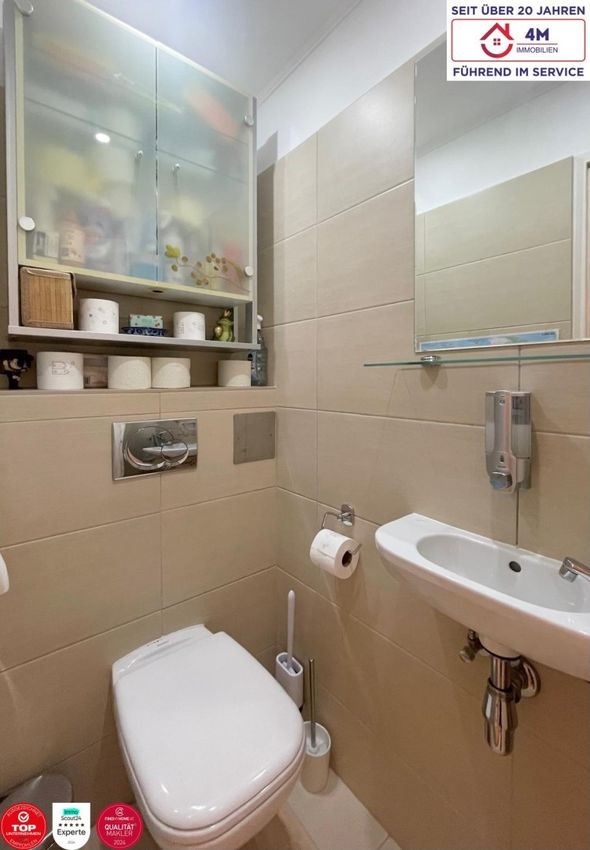 Das Badezimmer ist mit einer Badewanne ausgestattet und bietet ausreichend Platz für Waschmaschine und Trockner. Zusätzlich verfügt die Wohnung über eine separate Gästetoilette, sodass insgesamt zwei WCs vorhanden sind.