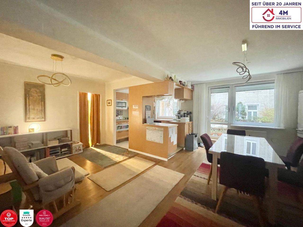 Herzstück der Wohnung ist der großzügige, über 45 m² große Wohnbereich, der eine nach Südosten ausgerichtete Wohnküche inkludiert. Der offene Wohn- und Essbereich bietet viel Platz für gemeinsames Leben und wird durch eine ca. 6 m² große, nordwestseitig ausgerichtete Loggia ergänzt. Diese eröffnet einen ruhigen Blick in den Innenhof sowie in den Stadtgarten und lädt zum Entspannen ein.