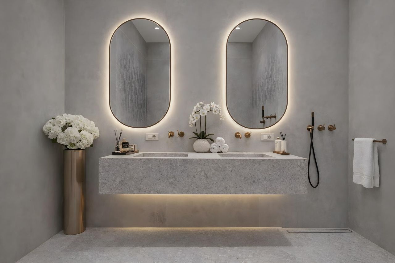 2 bathrooms with bathtub, walk-in shower, double-washbasin and WC
