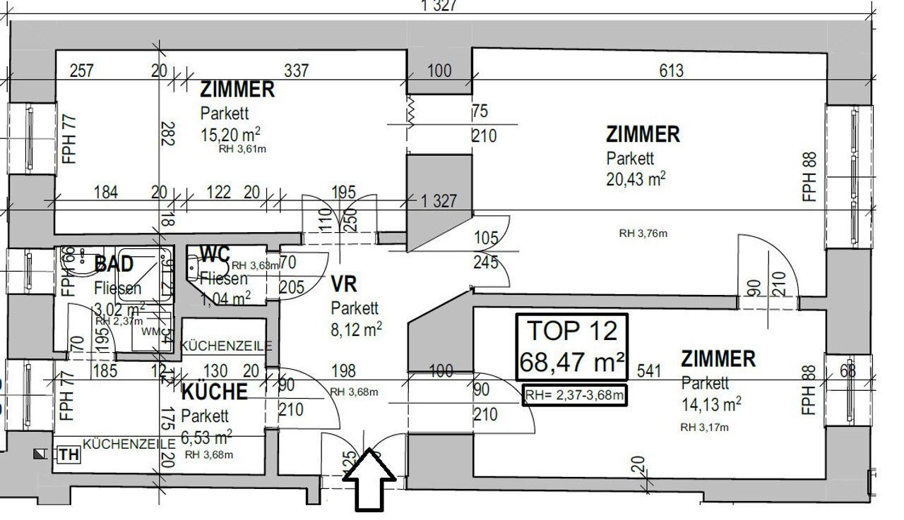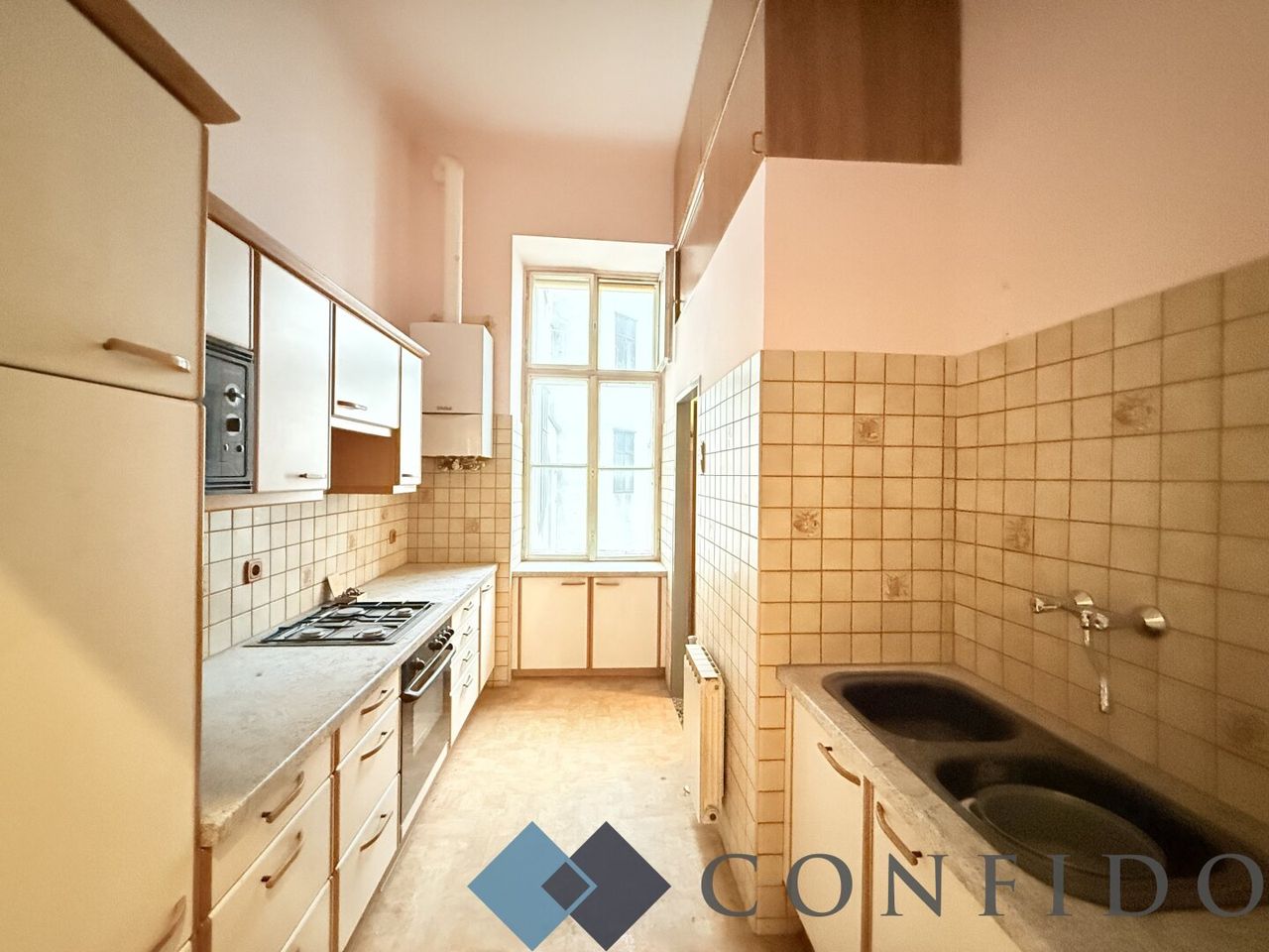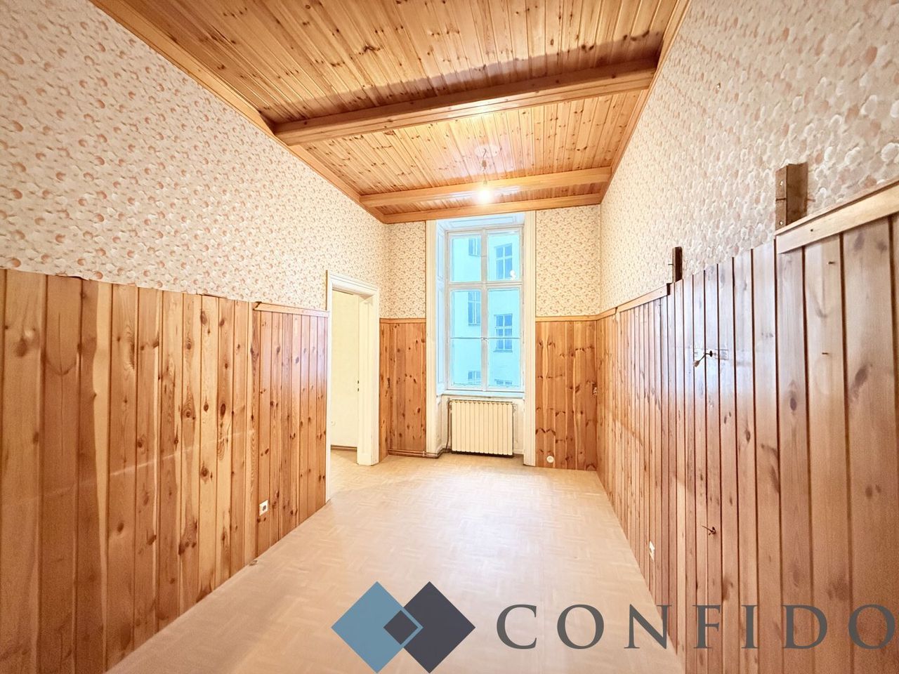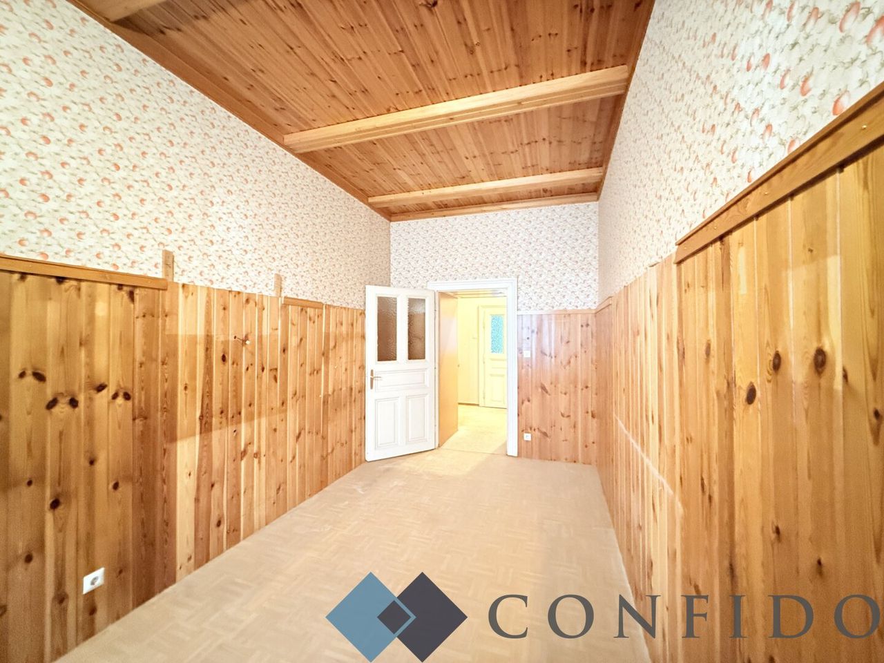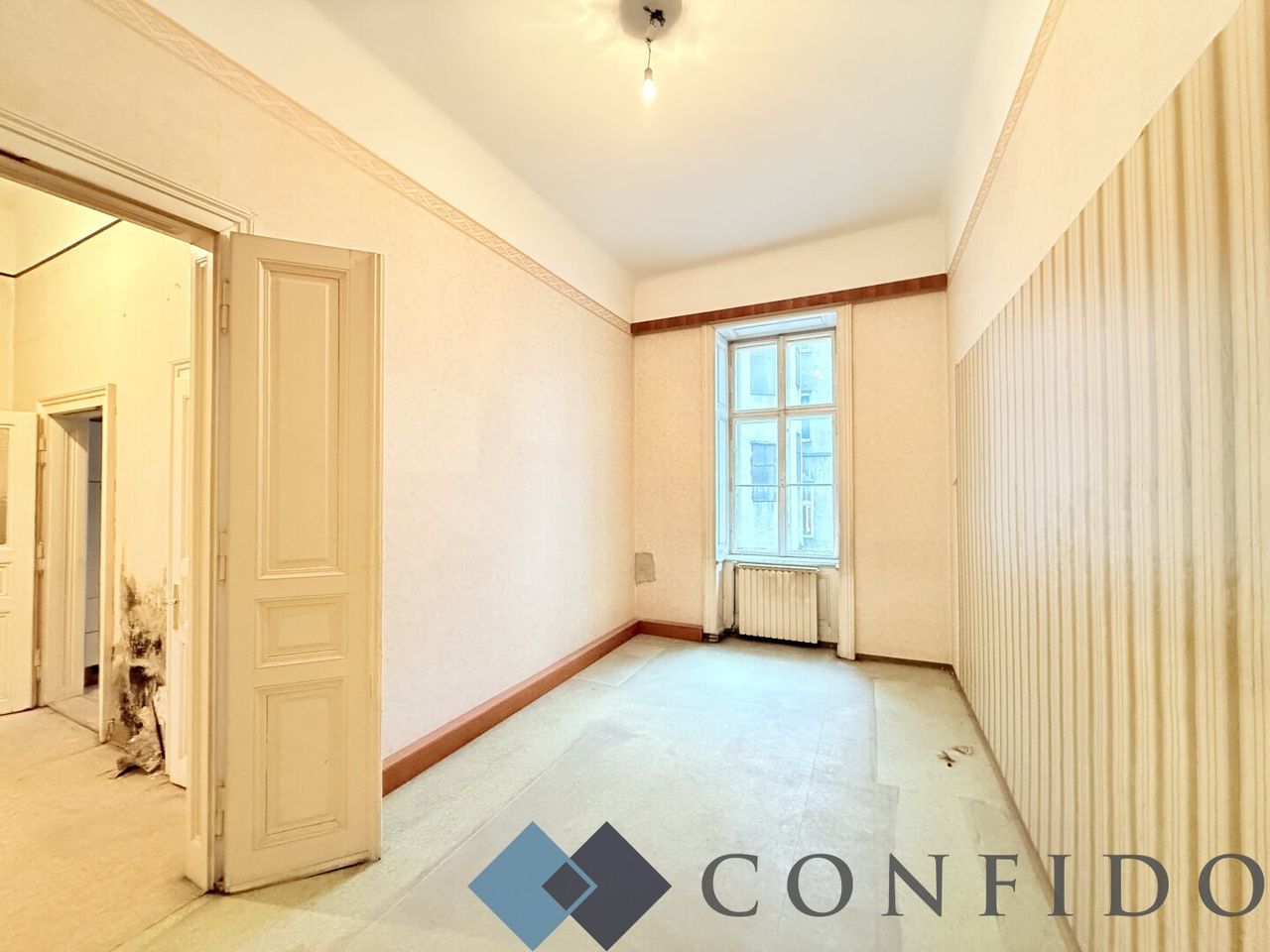 Über den Vorraum sind sämtliche Räume separat zu betreten, was eine flexible Nutzung ermöglicht. Das Herzstück ist ein rund 21m² großes Zimmer mit einem großen Fenster, das viel Licht hereinlässt. Angrenzend befinden sich zwei weitere Zimmer mit knapp 14 und 15m² , die ebenso unabhängig voneinander zugänglich sind. Besonders hervorzuheben ist die außergewöhnliche Raumhöhe, die stellenweise mehr als 3,70 Meter beträgt und den Räumen eine beeindruckende Großzügigkeit verleiht. Die Wohnung befindet sich in einem vollständig sanierungsbedürftigen Zustand, bietet jedoch dadurch zahlreiche Möglichkeiten, sie nach eigenen Vorstellungen zu gestalten und Materialien individuell auszuwählen.