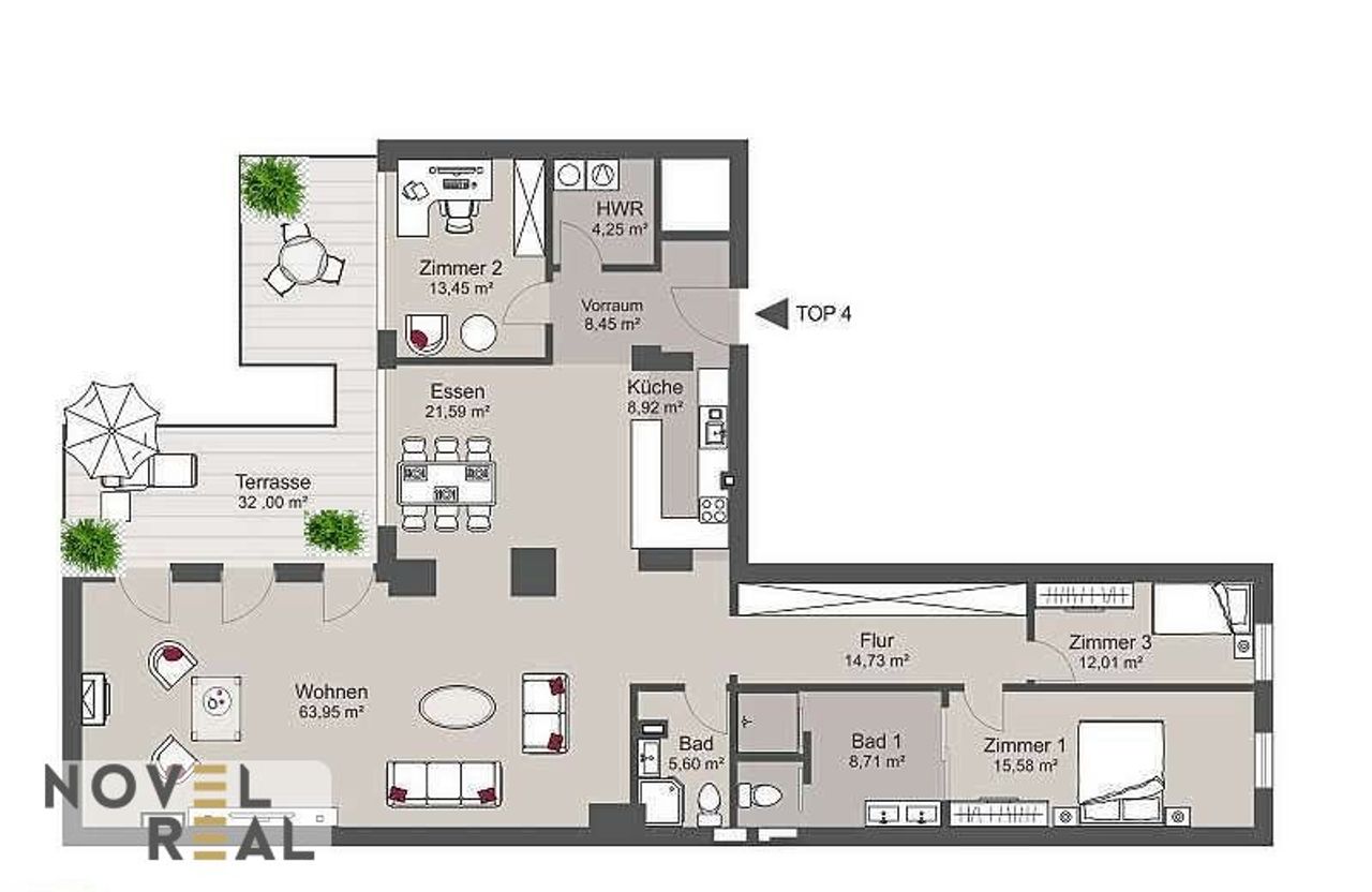 Die Maklergebühr ist ausschließlich bei Zustandekommen eines gültigen Rechtsgeschäfts fällig und vom Mieter an Novel Real Immobilien GmbH zu zahlen. Es wird ausdrücklich auf die Nebenkostenübersicht hingewiesen. Bei den Visualisierungen und Abbildungen der Immobilie (insbesondere von Inneneinrichtungen) kann es sich um Symbolfotos bzw. fototechnisch optimierte Fotos handeln.