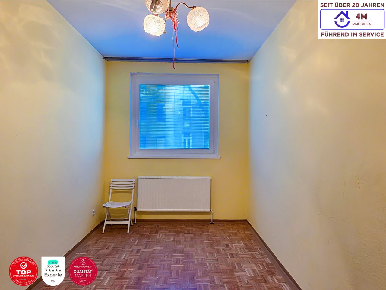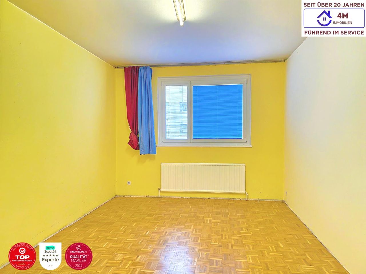 Zum Verkauf gelangt eine rund 98 m² große 4-Zimmer Wohnung im 1. Obergeschoss mit Lift in einem Wohnhaus aus dem Baujahr 1969. Die Wohnung befindet sich in sanierungsbedürftigem Zustand, verfügt jedoch über eine sehr gute Raumaufteilung mit mehreren getrennt begehbaren Zimmern sowie einem großen Schrankraum. Aufgrund der Wohnungsgröße und Raumaufteilung eignet sich die Wohnung sowohl für Familien als auch für eine Wohngemeinschaft oder als Anlegerwohnung zur Vermietung. Das Gebäude befindet sich in einem gepflegten Zustand. Die Fassade wurde bereits saniert und die Reparaturrücklage der Liegenschaft beträgt derzeit rund EUR 1.070.000, wodurch zukünftige Instandhaltungsarbeiten am Gebäude sehr gut abgesichert sind. Die...