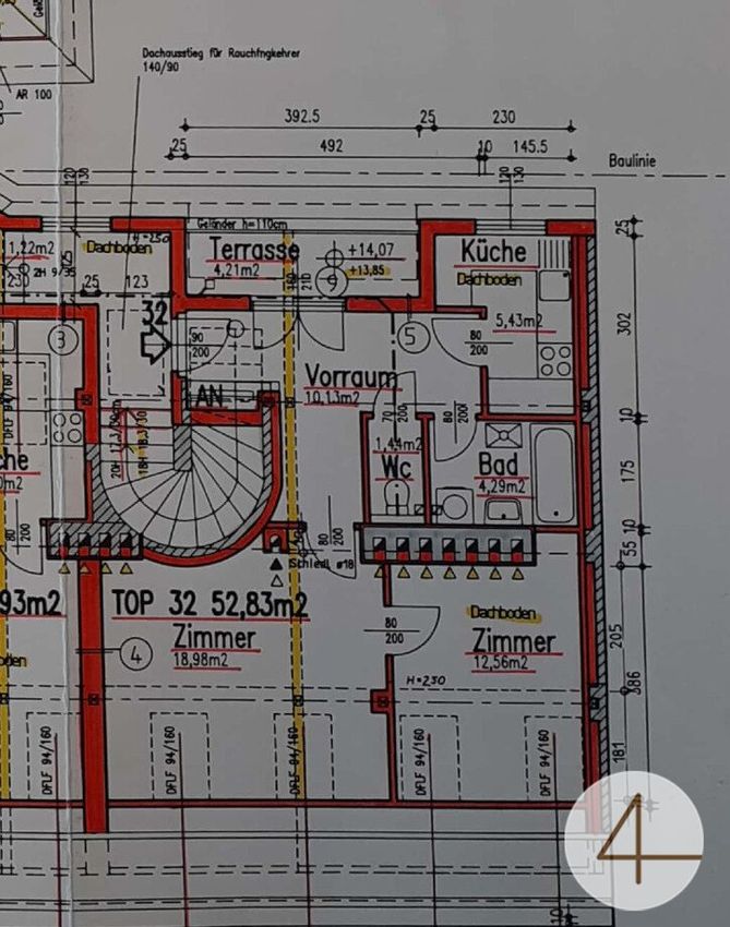 Vorraum 10,13 m² WC 1,44 m² Bad 4,29 m² Küche 5,43 m² Zimmer 18,98 m² Zimmer 12,56 m² Gesamt 52,83 m² Terrasse (Dachgeschoß) 4,21 m²