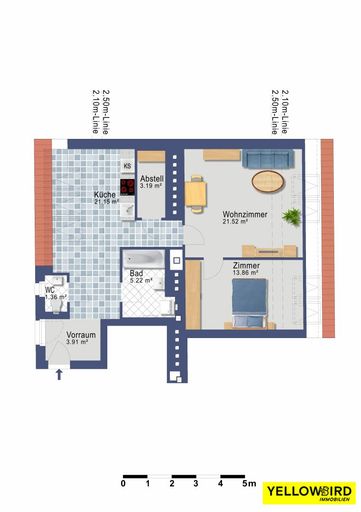 - Zimmer: 3 (21,2m² /Wohnküche - 21,5m² - 13,9m²)