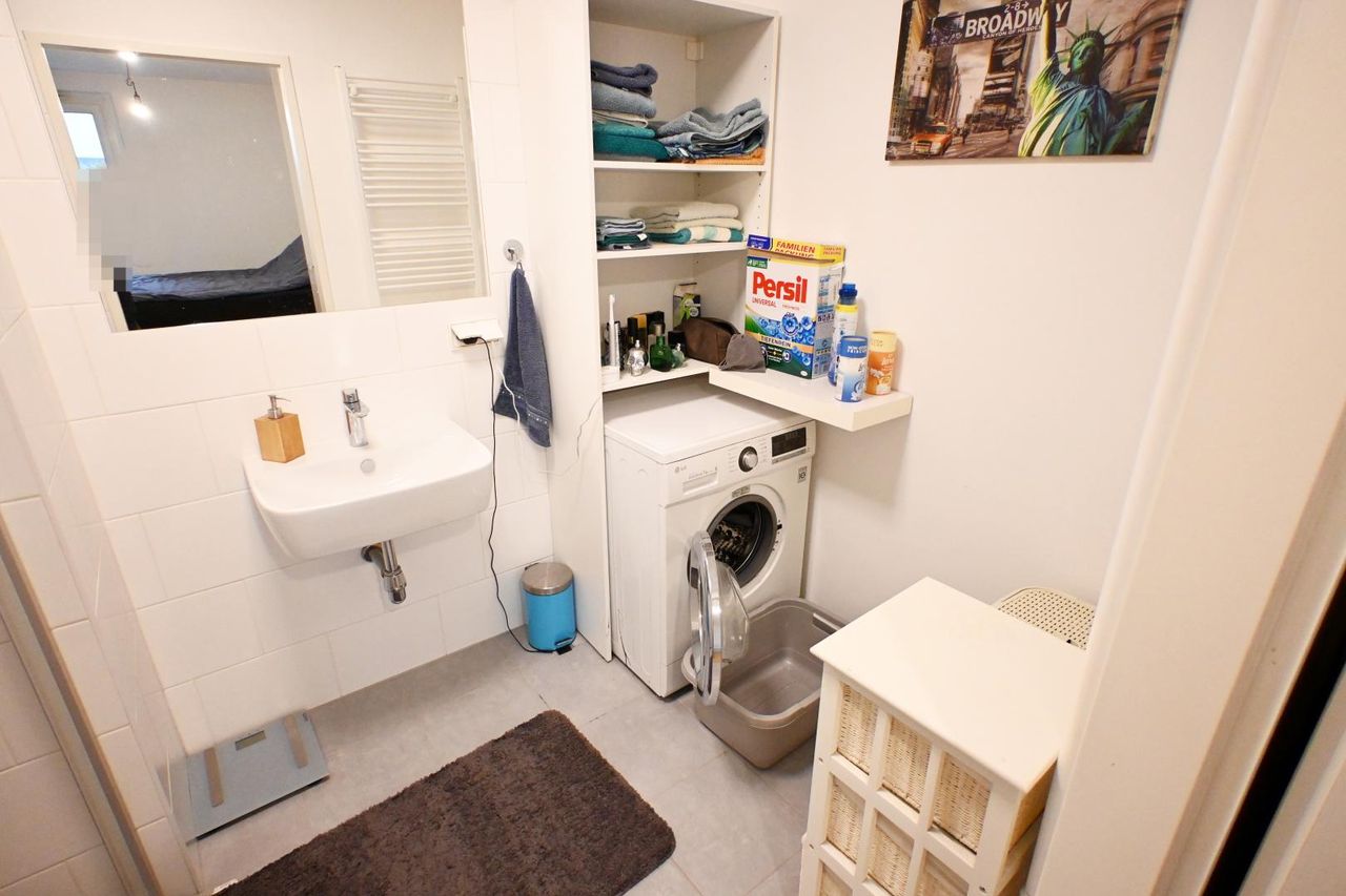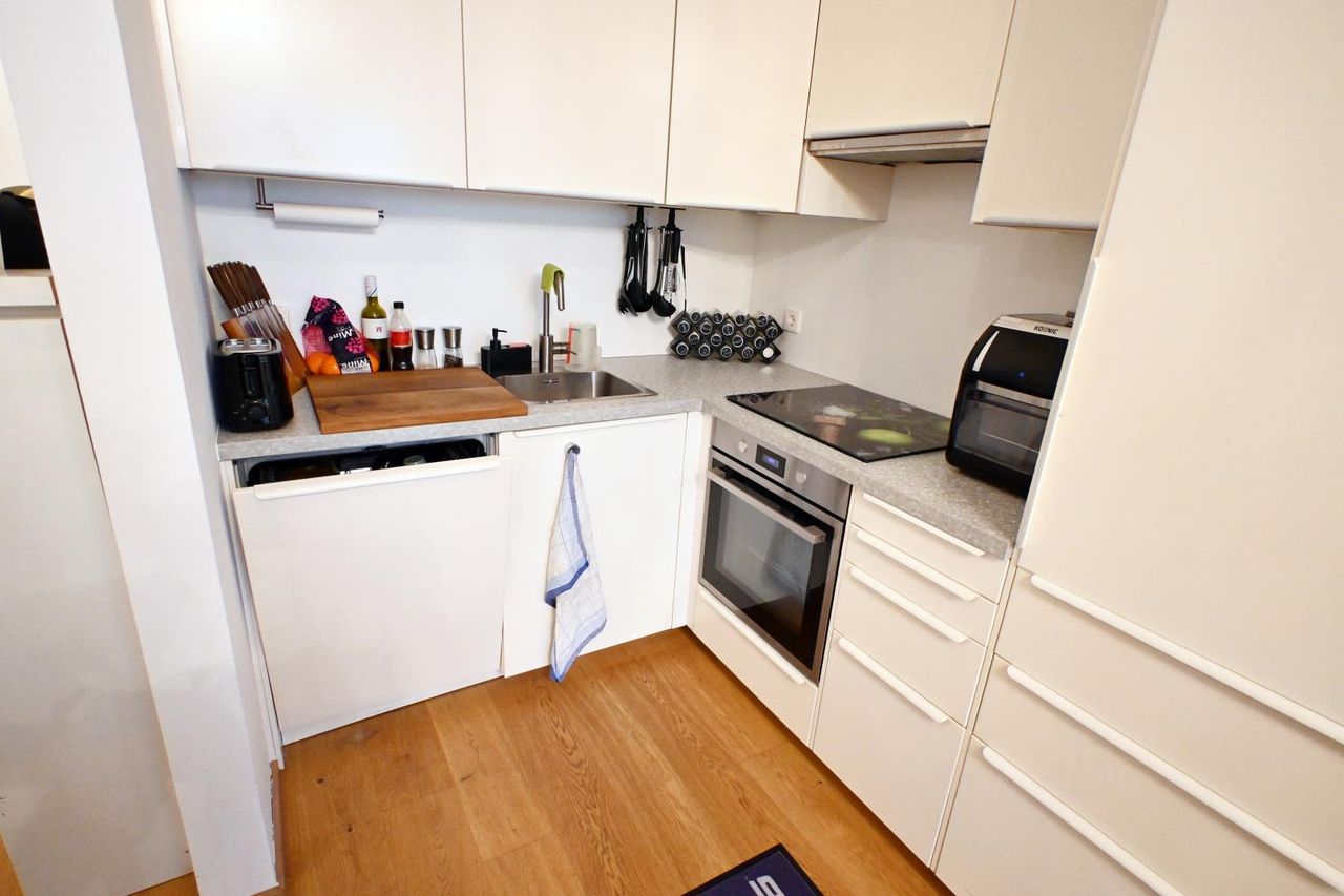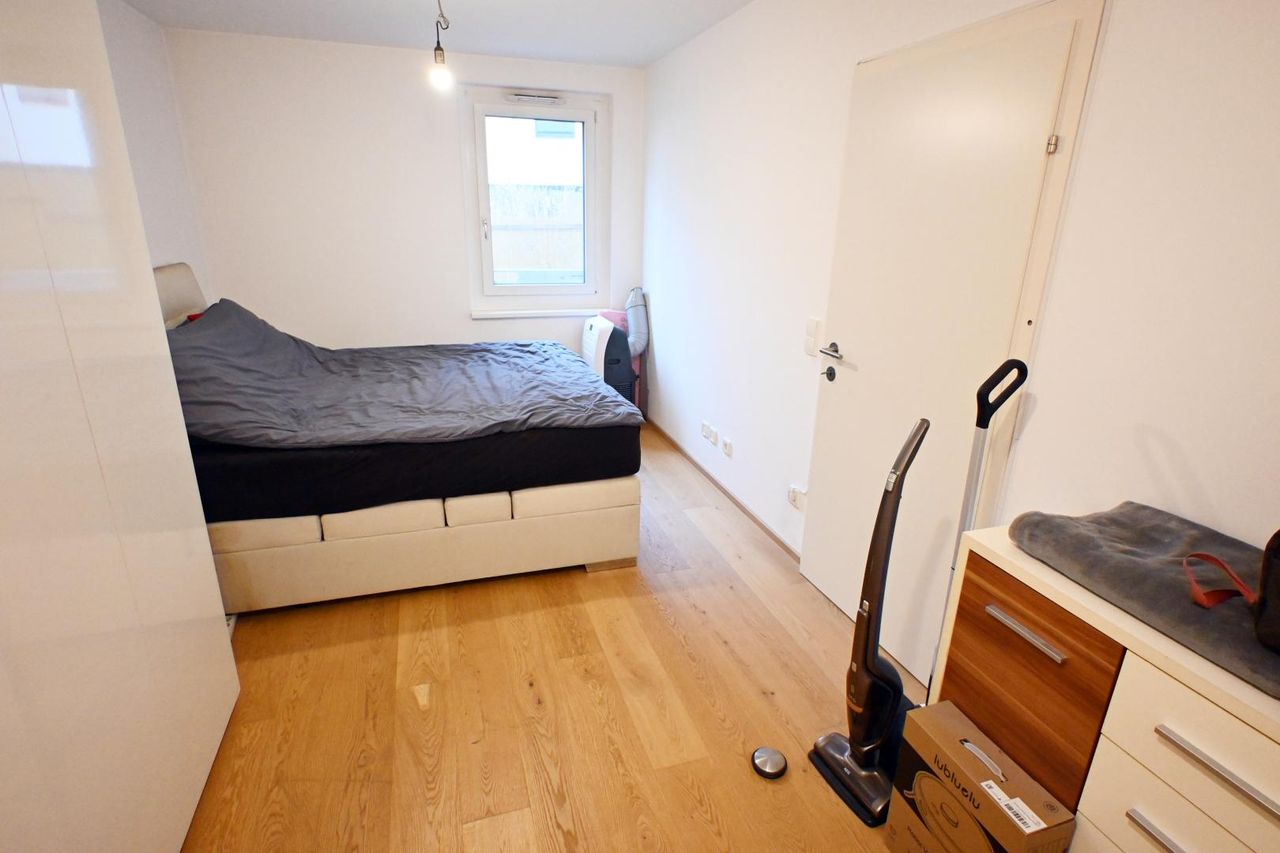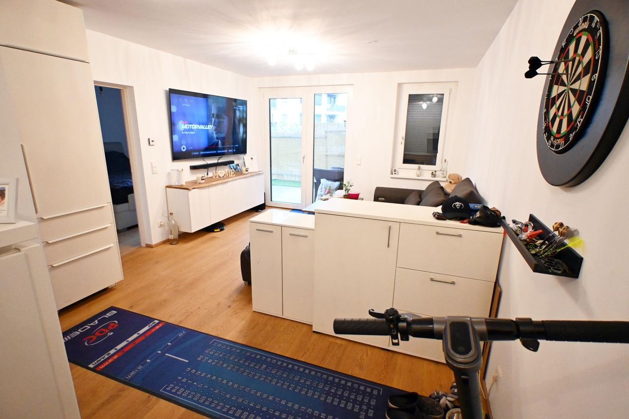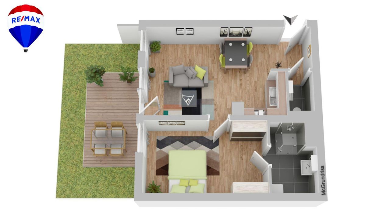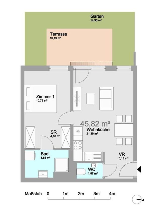 Es steht eine große Wohnküche zur Verfügung, inklusive komplett eingerichteter Küche mit Geräten, weiters ein Schlafraum, ein Badezimmer mit Dusche und Waschmaschinenanschluss, sowie ein separates WC. Von der Wohnküche gelangt man in den (eigenen!) Garten mit Terrasse (Richtung West/Südwest). Elektrische Außenjalousien gehören ebenfalls zur Ausstattung wie eine kontrollierte Wohnraumbelüftung und eine Fußbodenheizung (Fernwärme).