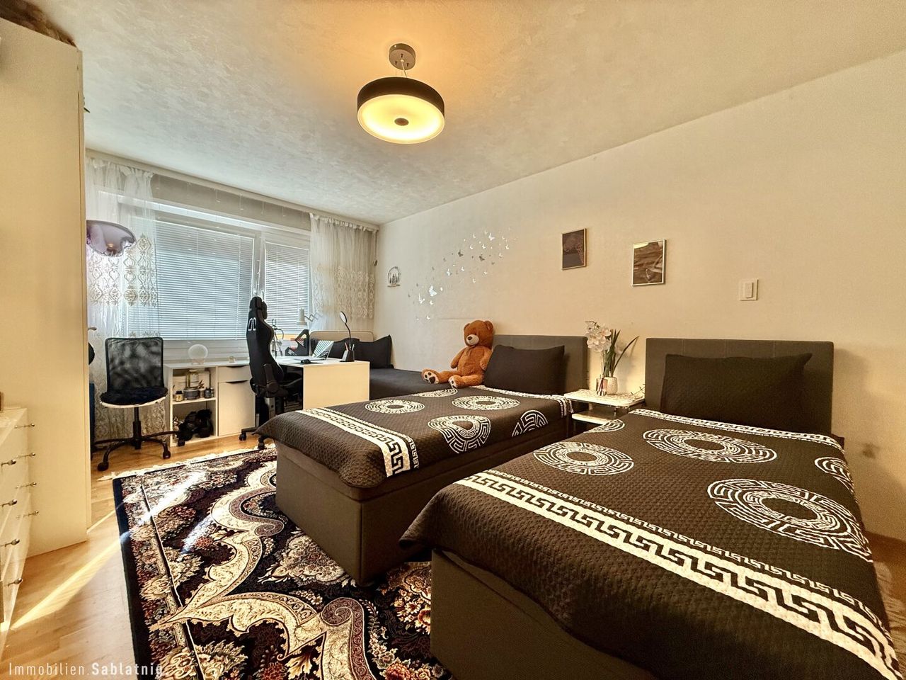 Die separate Küche ermöglicht eine klare Trennung von Wohn- und Kochbereich und bietet ausreichend Platz für funktionales Arbeiten im Alltag.Die Wohnräume sind mit Parkettböden ausgestattet und sorgen für eine warme und einladende Atmosphäre. Badezimmer und WC sind getrennt ausgeführt und erhöhen den Wohnkomfort zusätzlich.Elektrische Jalousien sind an allen Fenstern vorhanden.