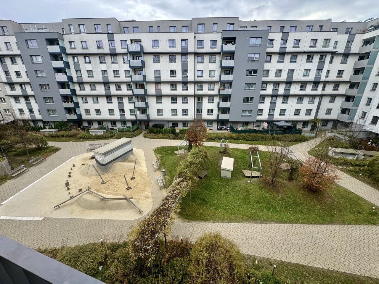 ein gepflegter Innenhof mit Spielplatz und Rutschen