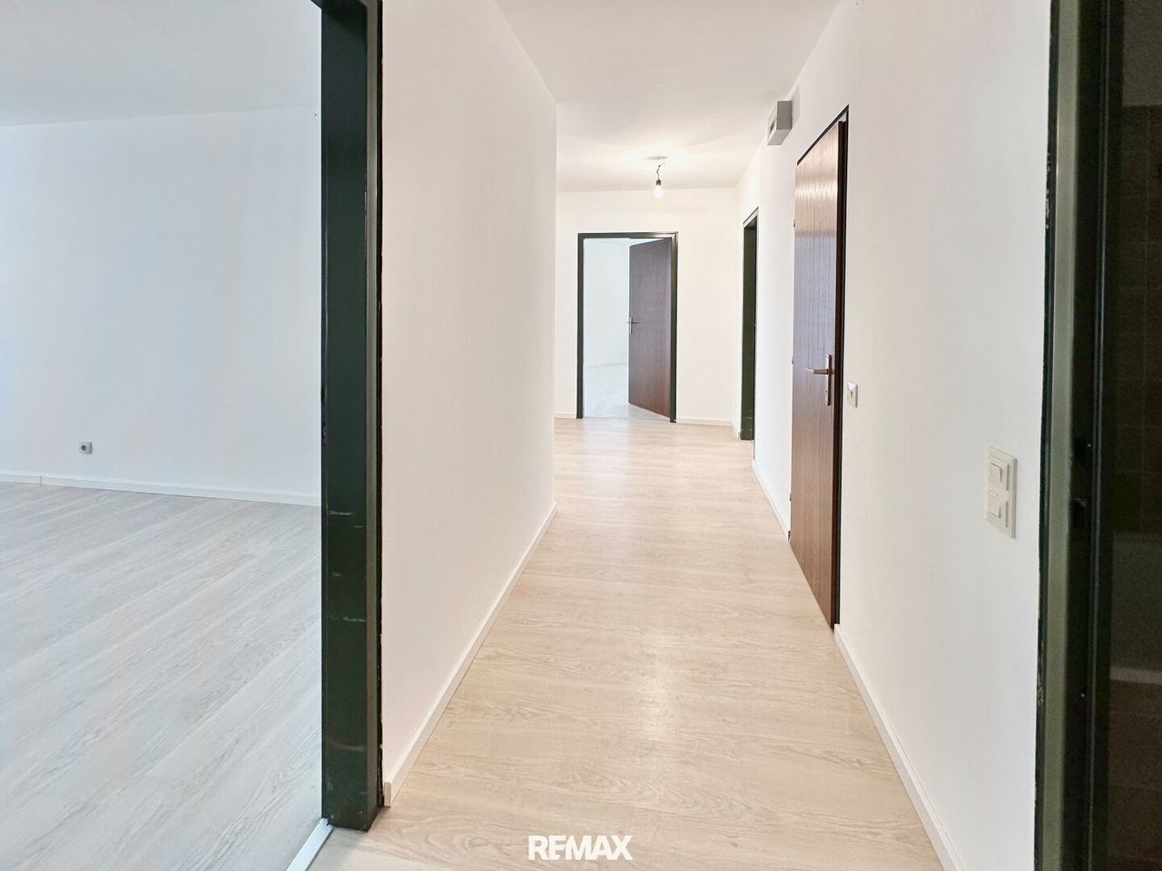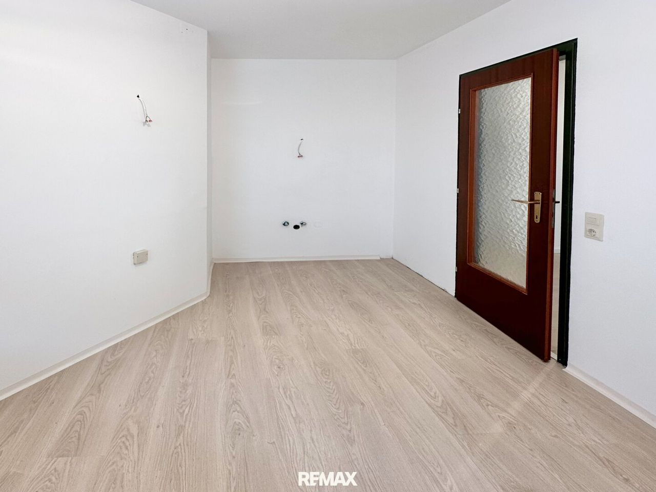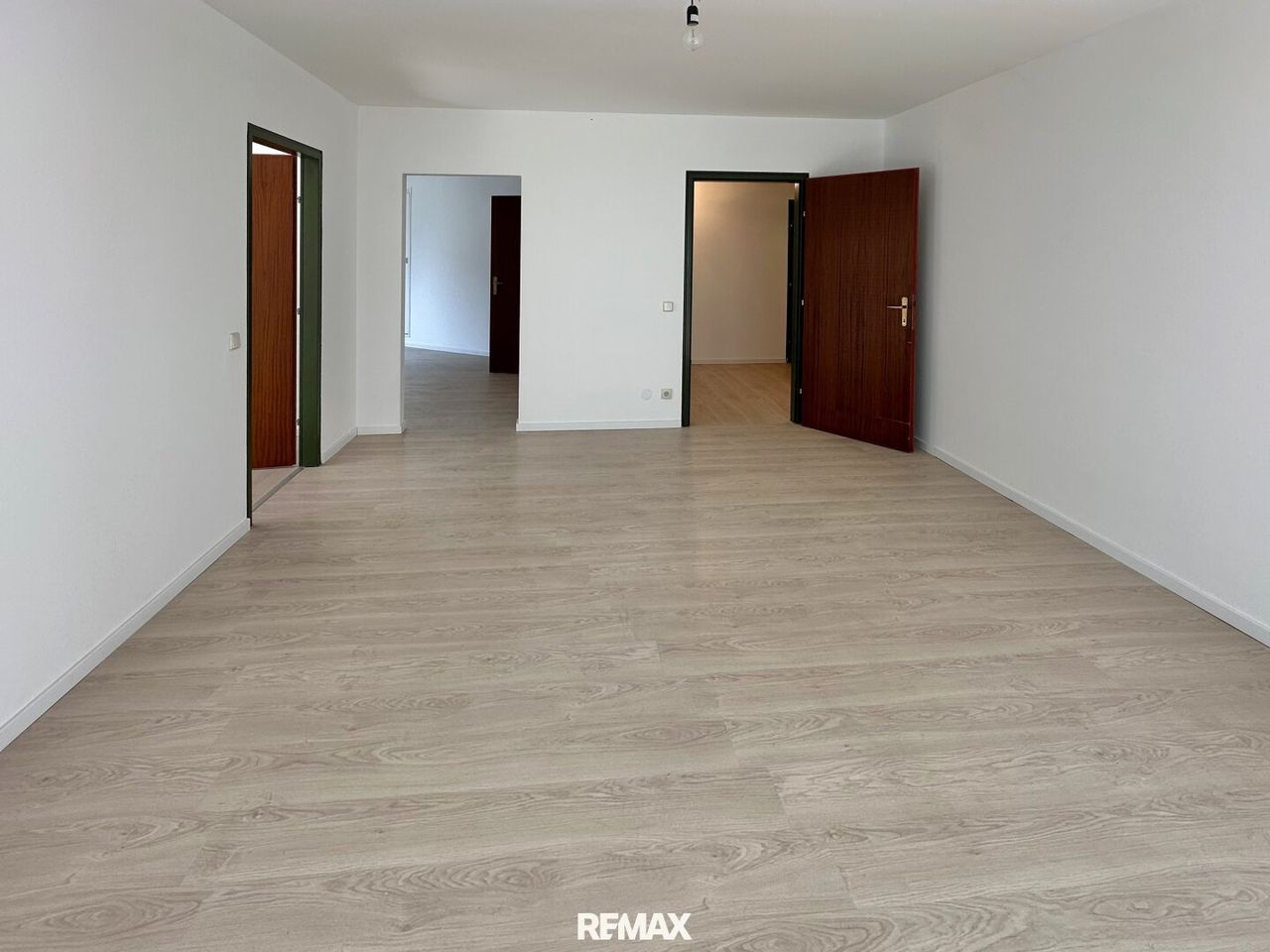 Geradeaus eröffnen sich 3 helle Wohnräume und ein separater Raum, in dem Sie nach Ihrem Geschmack Ihre Küche verwirklichen können.
