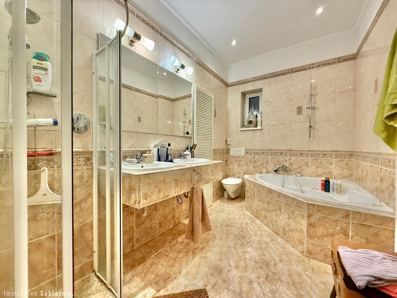 - Badezimmer (ca. 7,65 m²) mit Fenster, Badewanne, Dusche, Doppelwaschbecken, WC und Handtuchwärmer