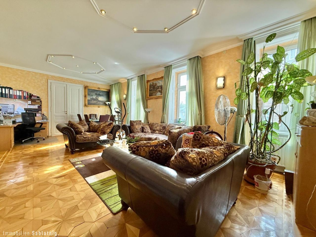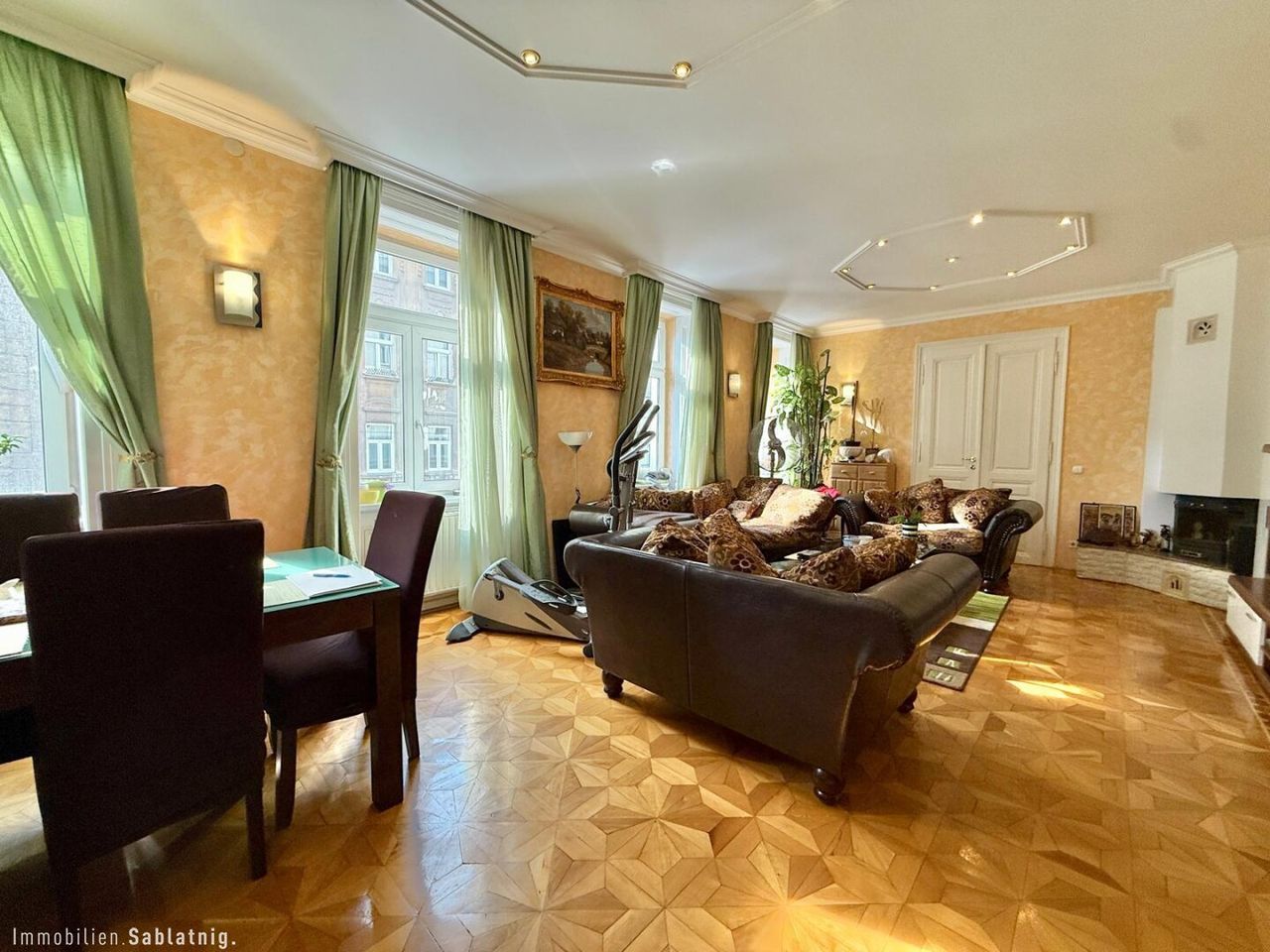 - Großzügiges Wohnzimmer (ca. 41 m²) mit vier großen Fenstern und viel Tageslicht