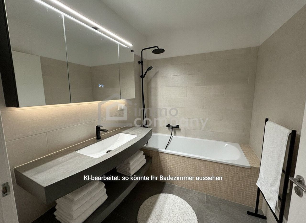 - Badezimmer mit Wanne, Waschbecken und Waschmaschinenanschluss