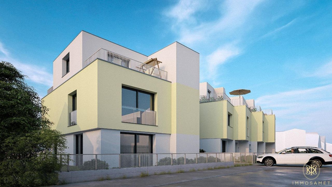 besticht mit einem Eckgrundstück und Gartenanteil von 122qm. Innen ist es aufgeteilt in 49qm im EG, 50qm im 1. OG und 11qm im DG mit einer 15qm Dachterrasse, umgeben von einem begrünten Flachdach. Gesamte Wohnnutzfläche = 111,19qm