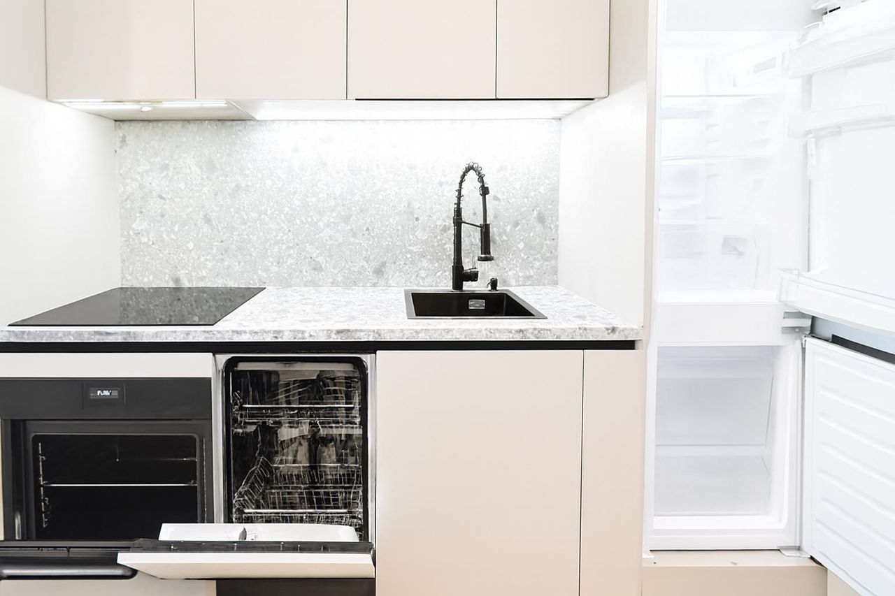 • Küche: Herd mit Ceranfeld, Kühl-Gefrier-Kombi, Spülbecken, Geschirrspüler