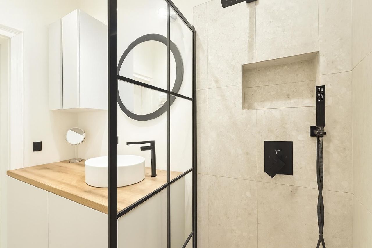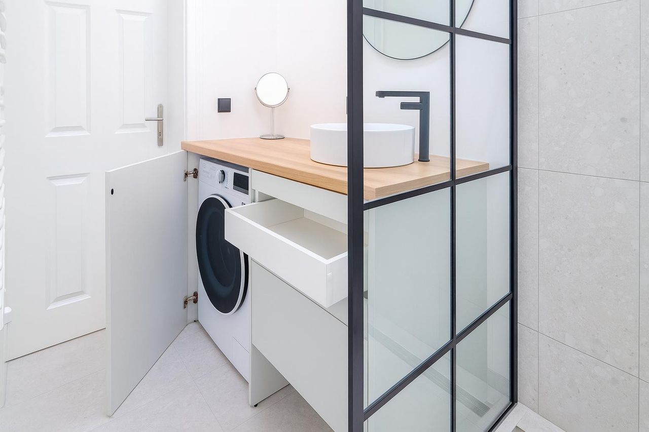 • Badezimmer mit Walk-In-Dusche, Waschtisch und Waschmaschine