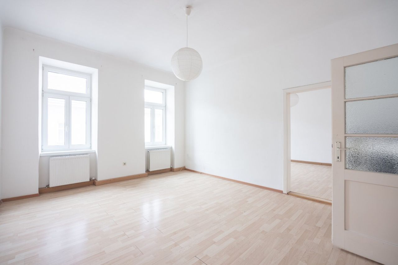 Diese 60 m² große Altbauwohnung bietet zwei großzügige Zimmer mit hohen Decken. Sie war bis vor kurzem vermietet und müsste daher saniert werden.
