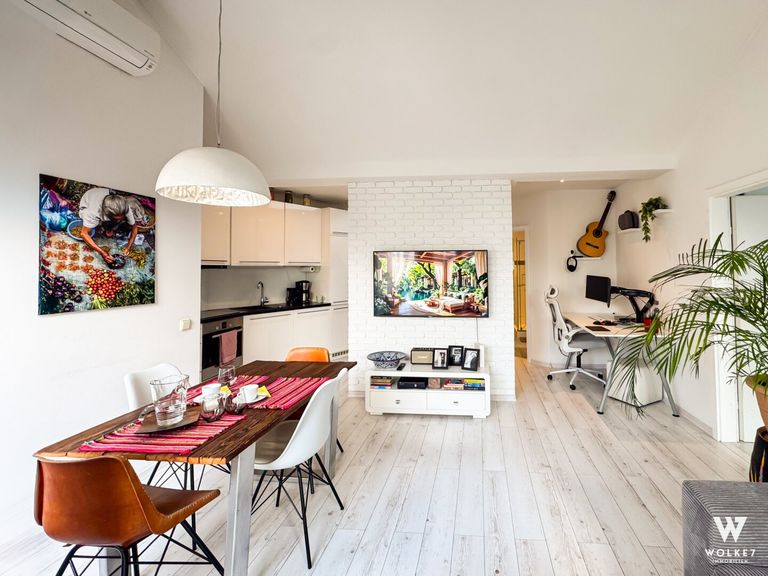 Die Wohnung ist lichtdurchflutet, mit Laminat- und Fliesenböden ausgestattet und wird mittels Gasetagenheizung beheizt. Im Wohnzimmer sorgt eine Klimaanlage auch an heißen Sommertagen für angenehmes Wohnklima. Die Raumaufteilung vermittelt ein offenes...