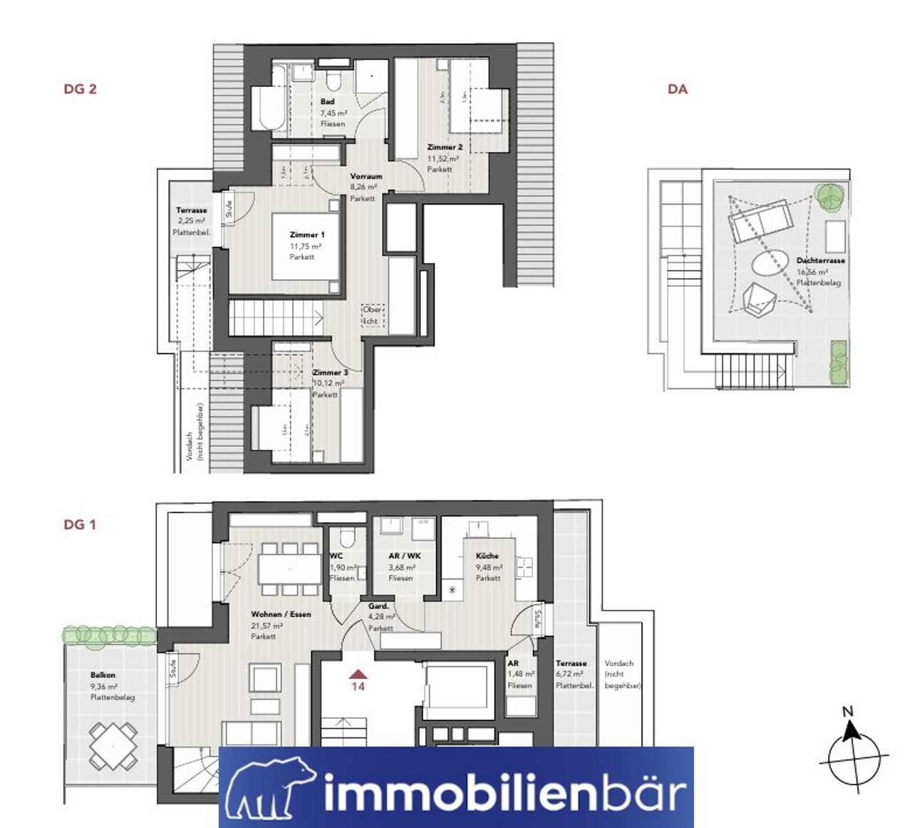 integrierten Pflanzentrögen. Zwei exklusive Maisonette- Wohnungen, eine davon mit Dachterrasse – großzügig gestaltet und mit atemberaubendem Blick über Wien. Jede Einheit überzeugt mit großzügigen Verglasungen, durchdachten Grundrissen und hochwertiger Materialwahl. Auch Nachhaltigkeit steht im Fokus: Eine Photovoltaikanlage und der Verzicht auf synthetische Dämmstoffe sorgen für ein angenehmes Wohnklima.