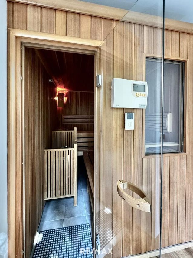 Im, dem Wohnraum gegenüberliegenden Trakt der Wohnung betreten wir den privaten Bereich. Das große Schlafzimmer, das nicht nur durch seine Ruhe, sondern auch durch seine Größe besticht ist auf der linken hinteren Seite mit einem eingerichteten praktischen Ankleideraum verbunden. Auf der rechten Seite befindet sich das zu diesem Zimmer gehörende Badezimmer mit Dusche, Doppelwaschbecken, Bidet und Toilette. Das Highlight ist aber die im Raum befindliche hochwertige Sauna mit Blick auf den seitlichen Teil des Gartens. Natürlich kann man auch von hier in den Garten gelangen. Nicht nur das - gleich an der Hauswand ist eine Dusche im Freien angebracht, hier kann man herrlich das kalte Wasser nach dem Saunagang an uneinsehbarer Stelle genießen.