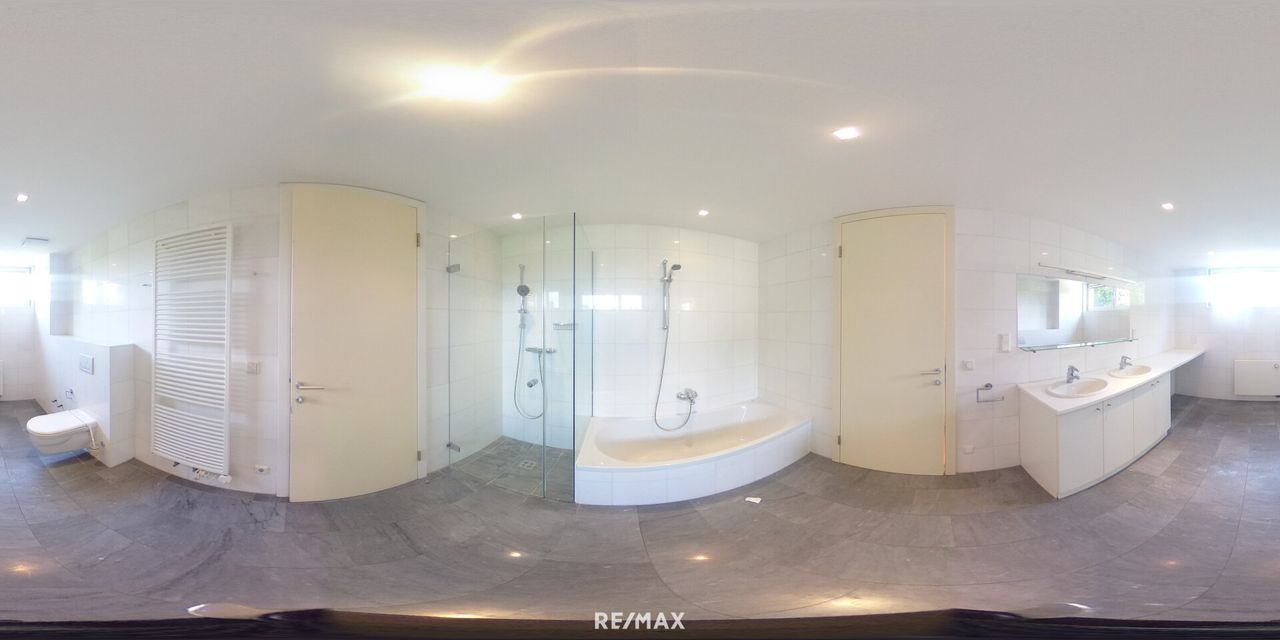 Auf der vom Eingang gesehen rechten Seite der Wohnung finden wir zwei weitere geräumige Zimmer, die durch ein gemeinsames Badezimmer miteinander verbunden sind. Doppelwaschbecken, Badewanne sowie eine separate Duschkabine findet sich hier gleichermaßen wie eine Toilette und der Anschluss für eine Waschmaschine. Das vordere der beiden Zimmer hat ebenfalls einen Ausgang auf die Terrasse und den Garten.