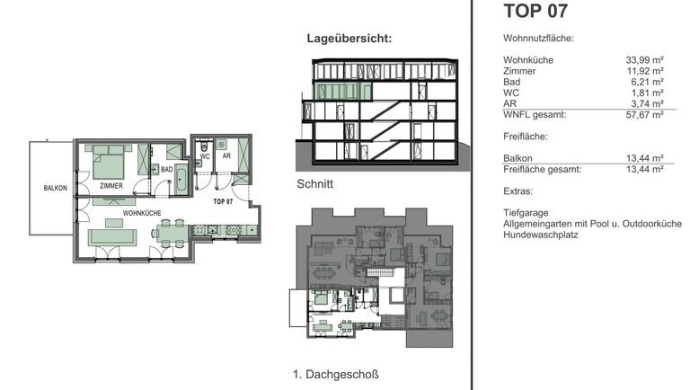 Diese hochwertig geplante Zweizimmerwohnungen (TOP 07) befindet sich im 1. Dachgeschoß und verfügt über eine ideale Raumaufteilung mit moderner Ausstattung und großzügigen Freiflächen. Die Wohnküche mit 33,99 m2 ist das Herzstück der Wohnung und bietet dank großflächiger Verglasung einen direkten Zugang zur Terrasse. Das Schlafzimmer ist ruhig gelegen.