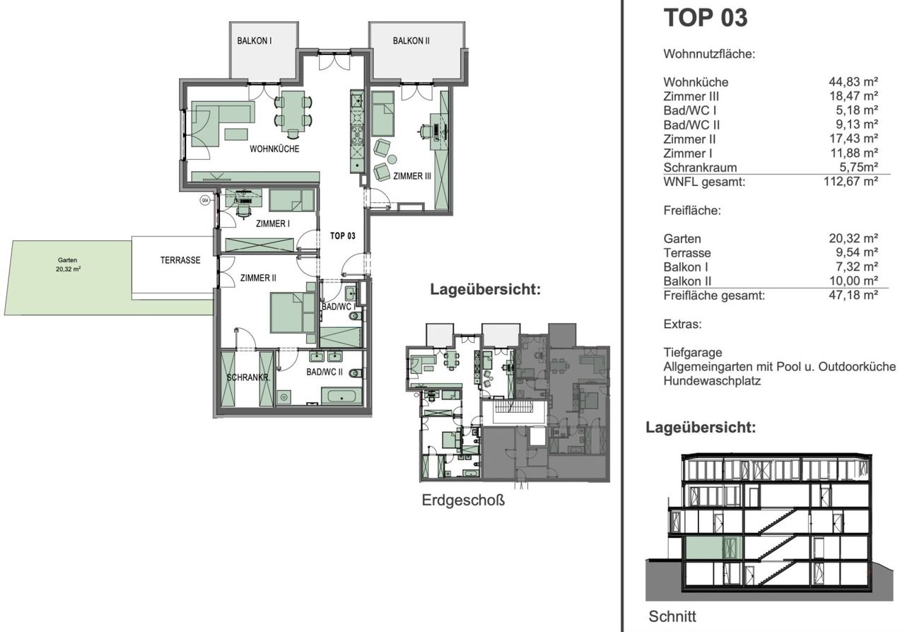Die großzügigen Freiflächen bestehen aus einem Garten (20,32 m²), einer Terrasse (9,54 m²) sowie zwei Balkonen (7,32 m² und 10,00 m²) – insgesamt 47,18 m² privater Außenbereich, der das Wohnangebot perfekt abrundet.