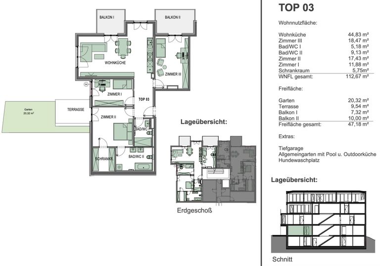Diese hochwertig geplante Wohnung (TOP 03) befindet sich im Erdgeschoß und beeindruckt mit einer großzügigen Wohnnutzfläche von 112,67 m² sowie weitläufigen Freiflächen. Die Wohnküche mit 44,83 m² bildet das Herzstück der Wohnung und bietet durch die optimal geplante Raumaufteilung viel Platz zum Wohnen, Essen und Entspannen. Die angrenzende Terrasse sowie der Gartenanteil sorgen für ein außergewöhnliches Wohngefühl mit viel Licht und Grün.