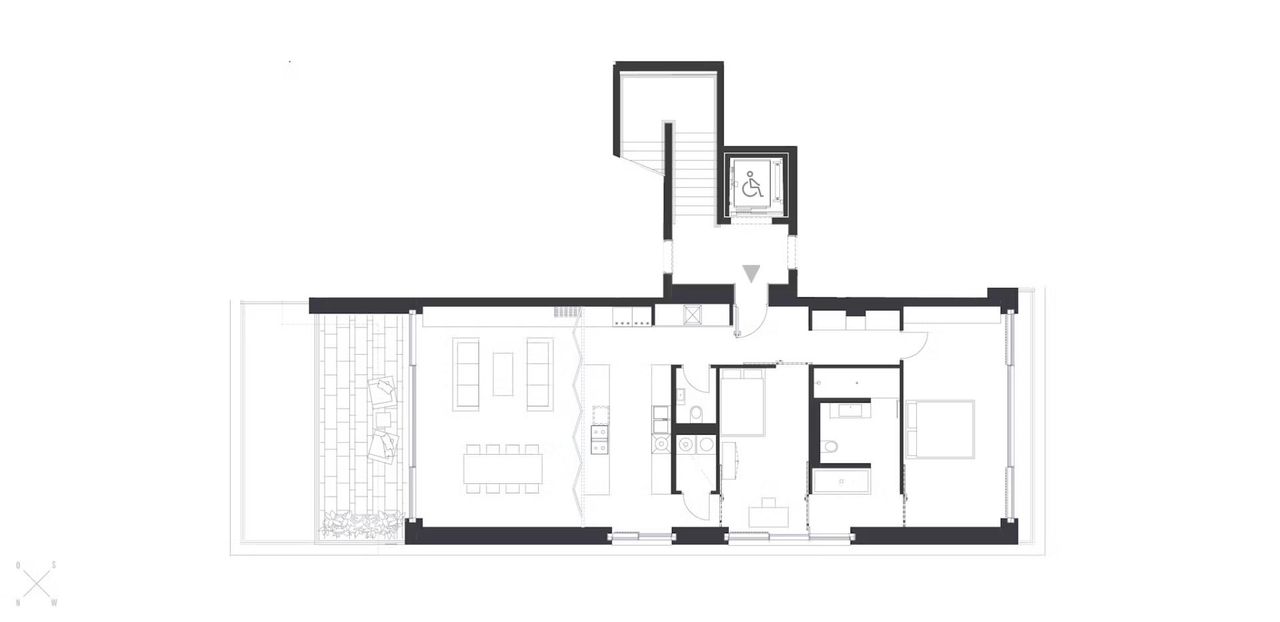 Das Apartment besticht durch einen offenen Grundriss, der den Wohn- und Essbereich großzügig miteinander verbindet. Große Glasfronten durchfluten die Räume mit Tageslicht und schaffen eine freundliche, einladende Wohnatmosphäre.