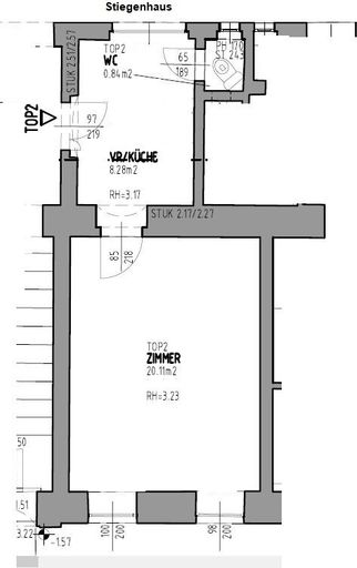 Top 2, Altbau zum Renovieren, Hochparterre, 1 Zimmer, Vorraum mit Küchenanschlüssen, extra WC (mit integrierter Dusche im WC)