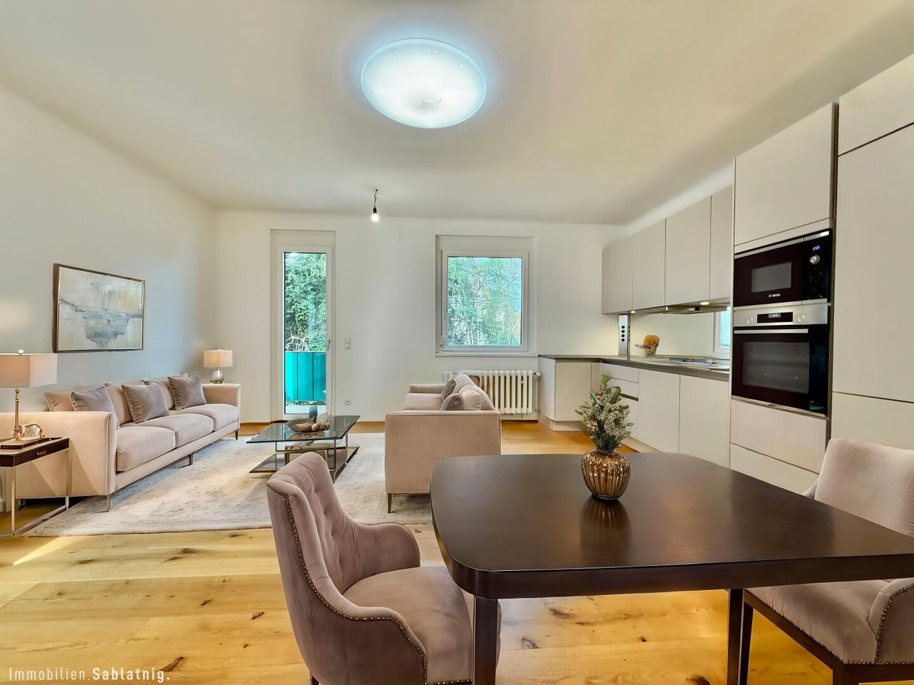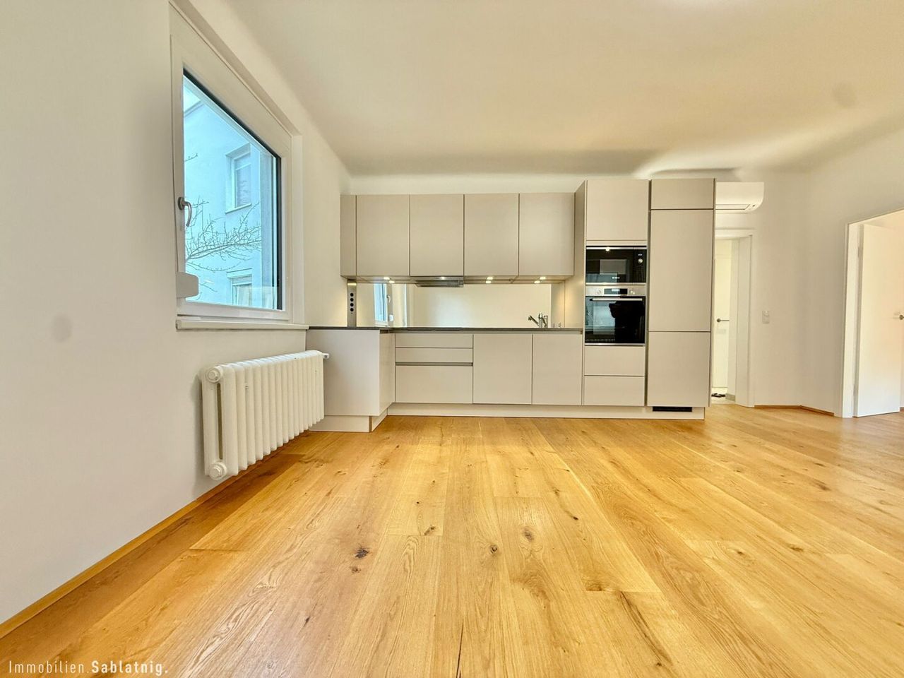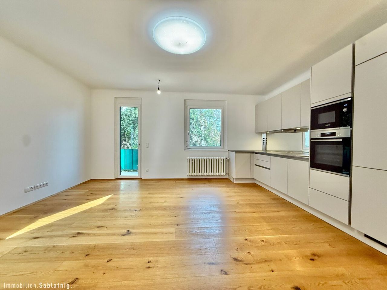 Herzstück der Wohnung ist die großzügige, offen gestaltete Wohnküche – ein heller, einladender Raum, der Kochen, Essen und Wohnen harmonisch vereint. Die moderne Einbauküche fügt sich nahtlos ins Raumkonzept ein und bietet viel Platz für gesellige Abende oder entspannte Stunden zuhause.