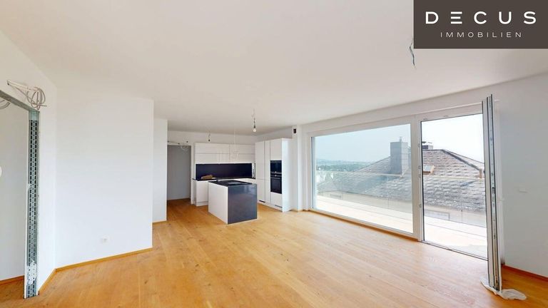 Die ca. 109 m² große Wohnfläche überzeugt durch ein durchdachtes Raumkonzept, viel Tageslicht und stilvolle Details. Der offene Wohn-/Essbereich mit direktem Zugang zur ca. 11 m² großen Loggia bietet einen einmaligen Ausblick über Wien – perfekt zum Entspannen und Genießen.