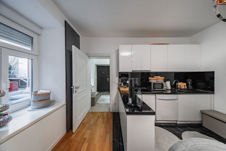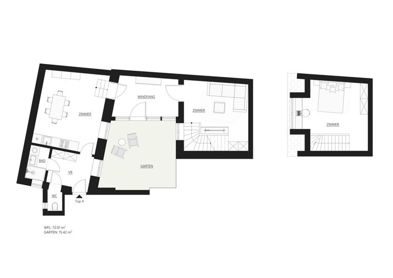 Die Wohnküche bildet den zentralen Aufenthaltsbereich der Wohnung. Der ca.15 m² große Garten im ruhigen Innenhof bietet einen wertvollen privaten Außenraum, ideal für entspannte Stunden oder individuelle Gestaltungsmöglichkeiten. Das Schlafzimmer dient als ruhiger Rückzugsort, während die offene Galerieebene im Obergeschoss – aktuell ebenfalls als Schlafzimmer genutzt – vielseitige Möglichkeiten eröffnet, etwa als Arbeitsbereich, Gästezone oder Ankleide.