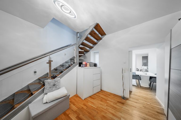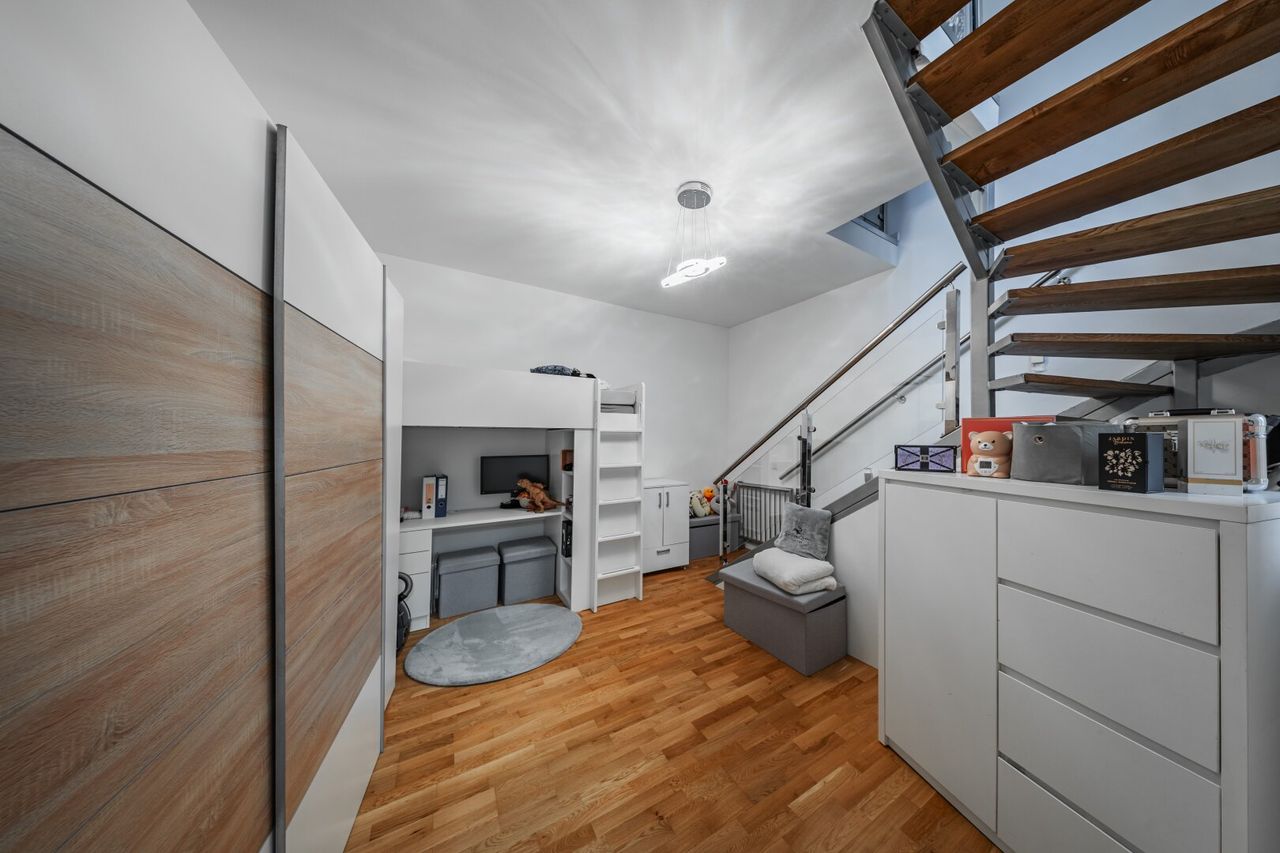 Das Schlafzimmer dient als ruhiger Rückzugsort, während die offene Galerieebene im Obergeschoss – aktuell ebenfalls als Schlafzimmer genutzt – vielseitige Möglichkeiten eröffnet, etwa als Arbeitsbereich, Gästezone oder Ankleide.
